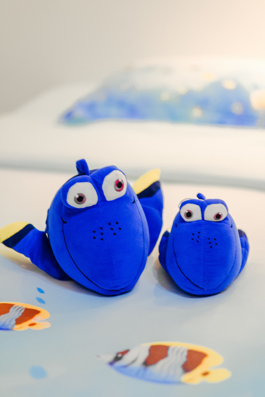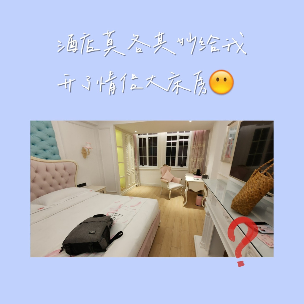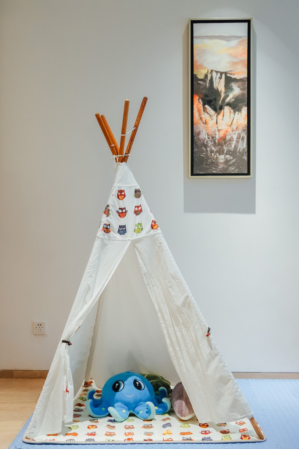 房间角落还有小帐篷??、小桌椅,床上有可爱的卡通公仔,带娃来这里的话超合适。
