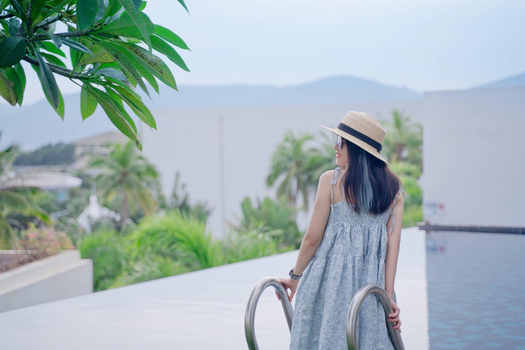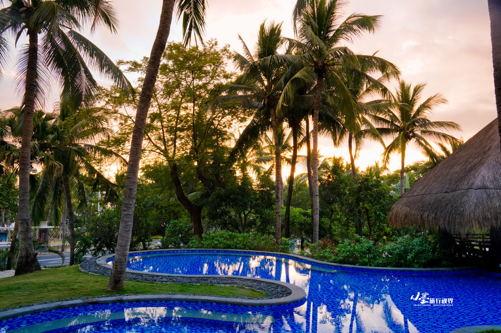 在阳光灿烂的日子里,酒店前方的泳池和园林是拍照的好去处。