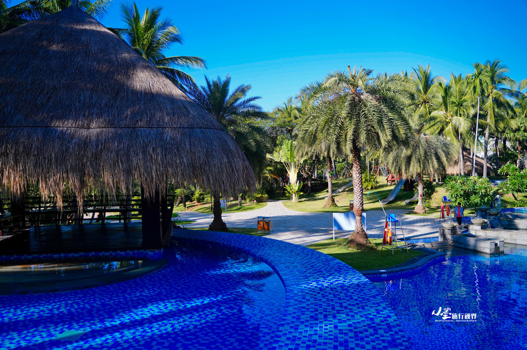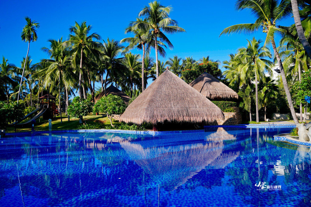 阳台下的游泳池仿佛一个个大小不一的湖泊,如珍珠般散落一地。阳光下,椰树的影子在水面摇晃着,每个角度都自成风景。