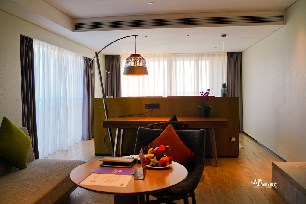 客厅卧室全开放式的布局,崭新的家具和设施展现着现代艺术的格调,餐桌上摆放着新鲜的热带水果和糕点,森林风的地毯弥漫着清新的气息,还有超大号的办公桌满足商旅办公需求。客房人员提前用鲜花摆出“欢迎入住”四个字,同时附上手写的欢迎小卡片,还准备了时令水果和点心,非常贴心。
