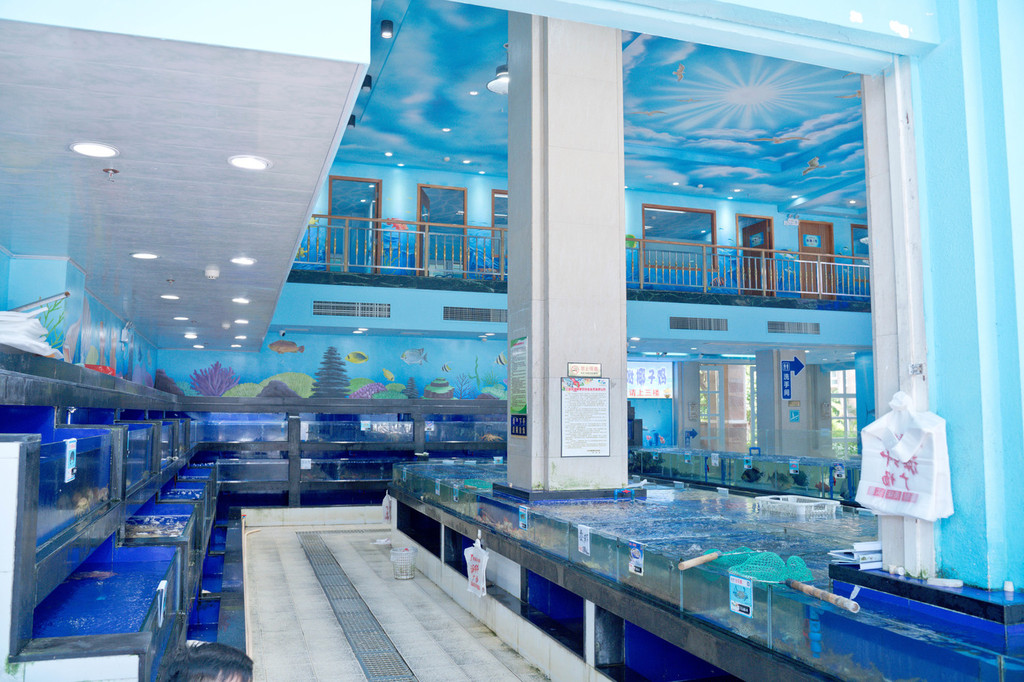 进入店内,便被蓝色的 洋风包围了起来,店内服务员非常热情,细心地将餐厅一一介绍。一楼整层都是 池,种类之丰富像是把大海搬进了餐厅,你能想到的 在这里基本都可以找到,现挑现杀,非常新鲜。如果你时间充裕,完全可以将这片大海蘸上佐料,吃他一个肚儿圆。