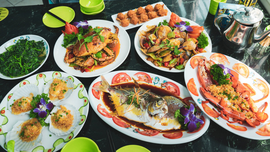 海南 墨鱼丸、清蒸红石宝鱼、爆炒花海螺、蒜蓉大元贝蒸粉丝、蒜蓉蒸 波士顿 大龙虾、蒜蓉 海南 野菜、香辣大面包蟹等通通上场,肉质鲜嫩可口、菜品分量也很足,期间服务员也会及时撤盘。