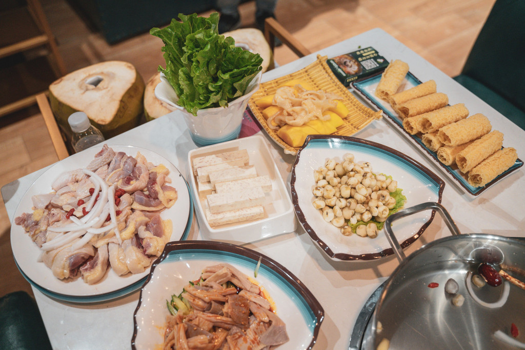 煮开下鸡肉三分钟闹铃一响、就会有服务员过来开锅、这个时候就可以开动了、椰汁清甜解腻,鸡肉嫩滑弹牙,再沾上服务员特调的灵魂酱料,鲜甜爽口,连鸡肉的鲜香也提升了好几个level。清爽可口又不用担心长胖,妥妥的小仙女必备美食。