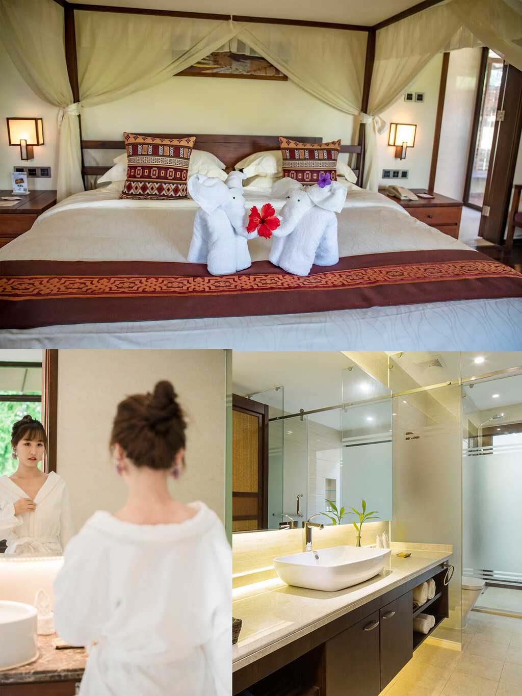 酒店园区随处可见一些带有东南亚风情的雕像,别墅建筑也是东南亚风格的。客房里面的设计也很有特色,大量使用落地窗,房间的采光也很好,三面都是窗户,窗外就是绿意盎然的园林景致。房间里用的是分体式空调,有独立卫生间,有意思的是主卧室的浴缸是露天的,夜晚泡澡可以看到夜空。