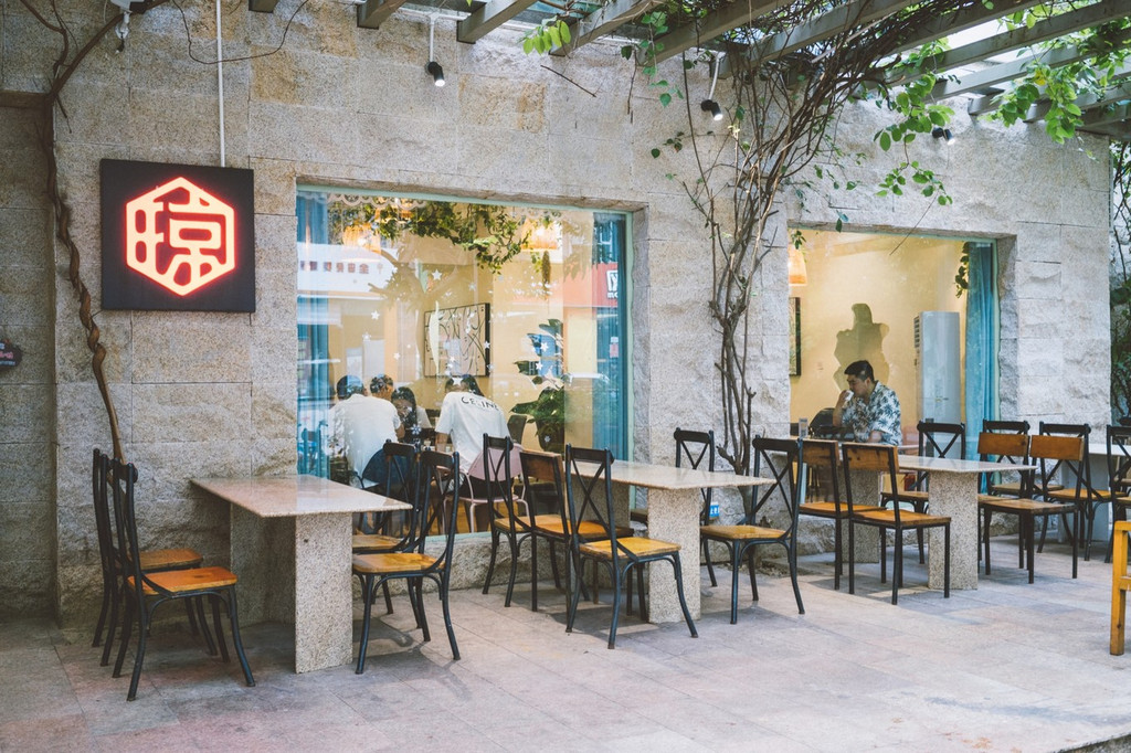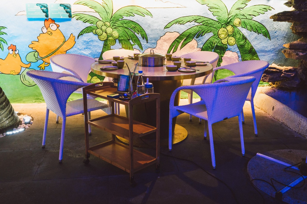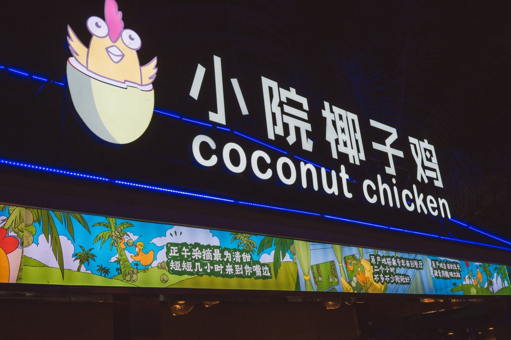 是一个比较新的一个商圈里,多个餐厅汇聚在一起,夜晚的灯光很酷,小桥流水走到角落里的[小院椰子鸡],带遮阳伞的露天座位区,开放式的厨房,下雨天就不太容易吃饭。