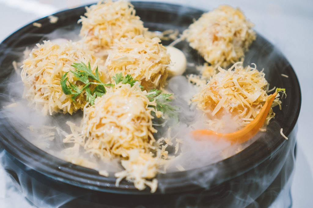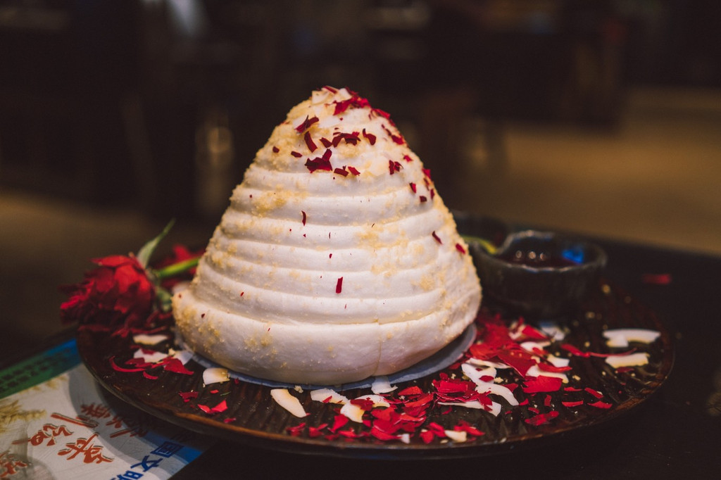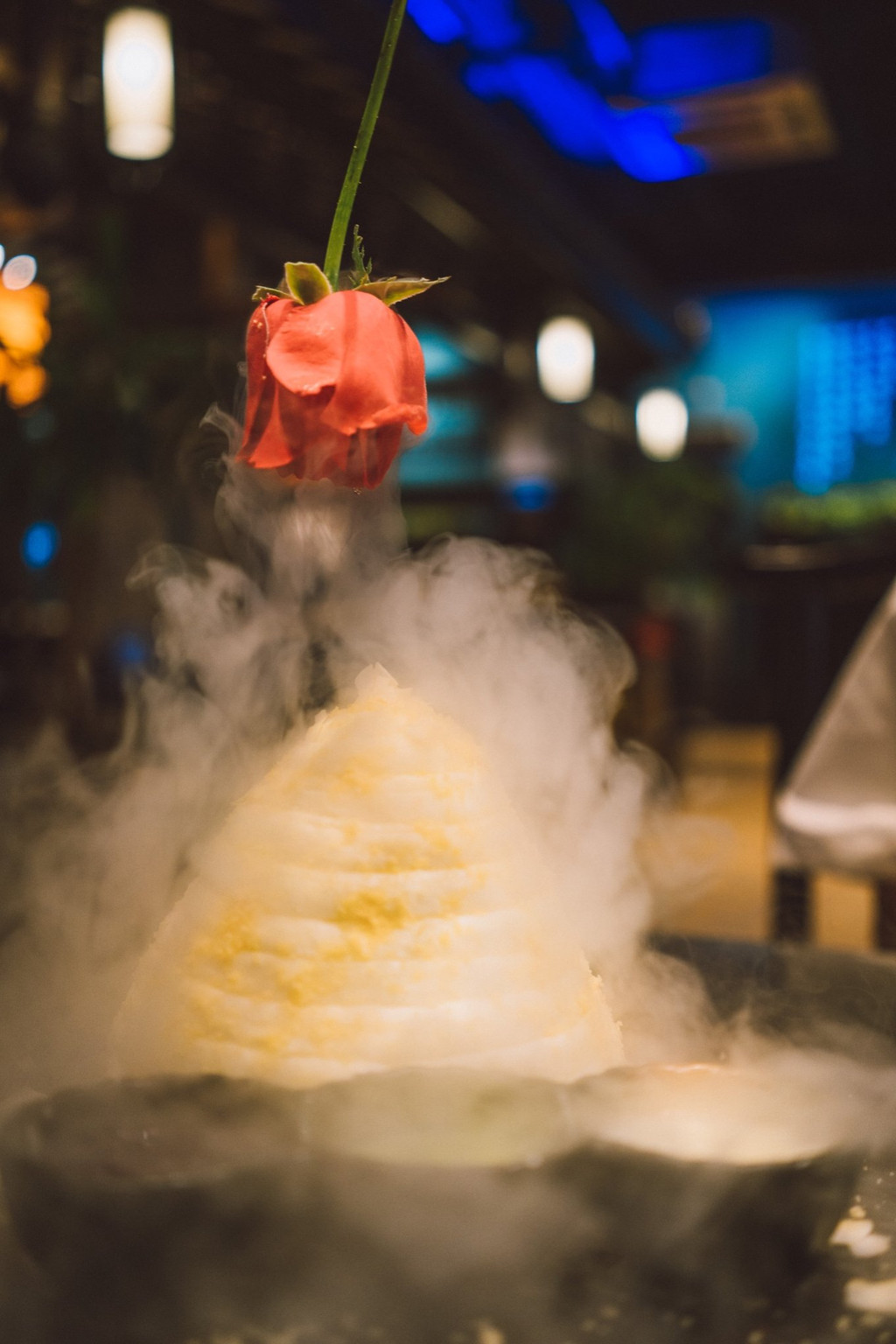 一个大花卷,拿上来干冰玫瑰🌹,让同伴用手轻拍,瞬间花瓣落下,出乎我的意料,满嘴椰香,蘸上炼乳很好吃,看视频更能感同身受。