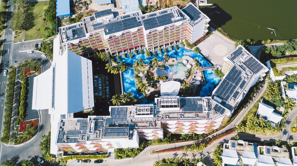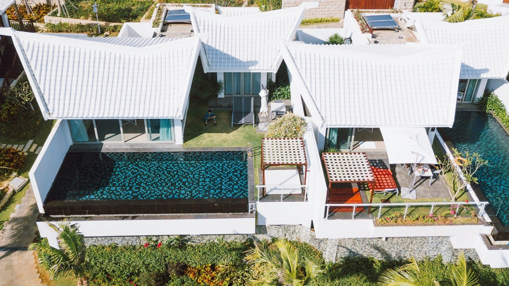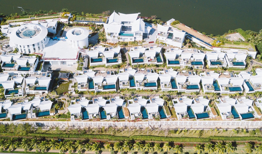 空中看迎宾馆,一排排的别墅泳池,出现在镜头下。