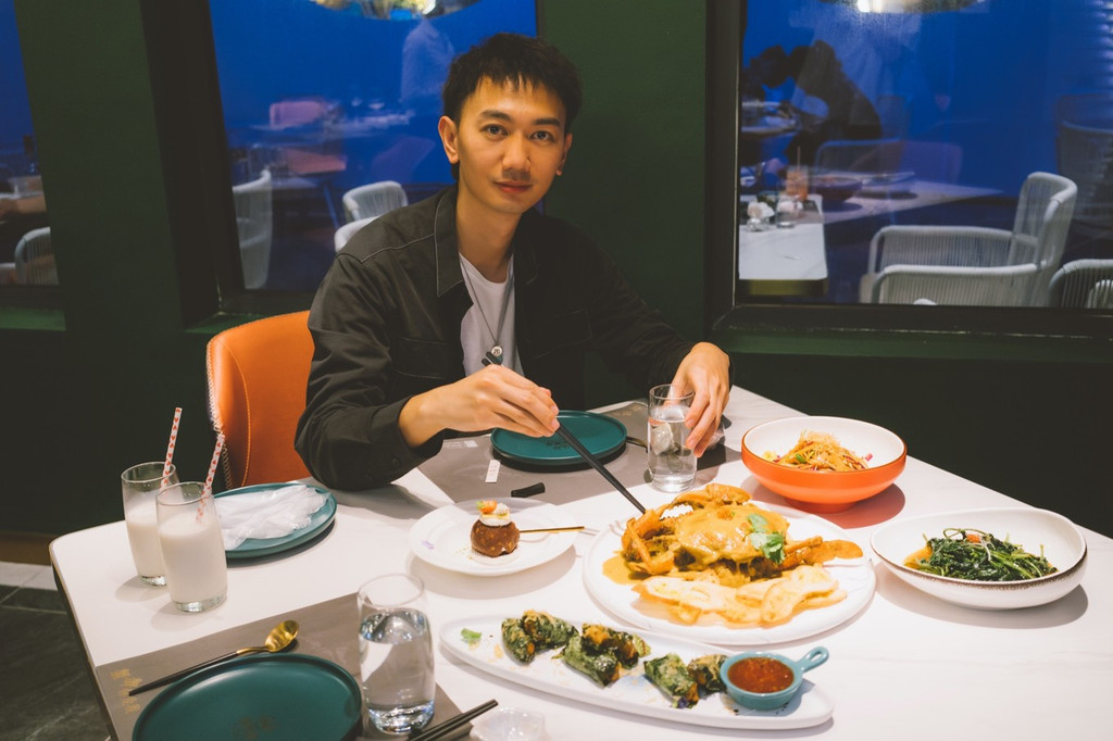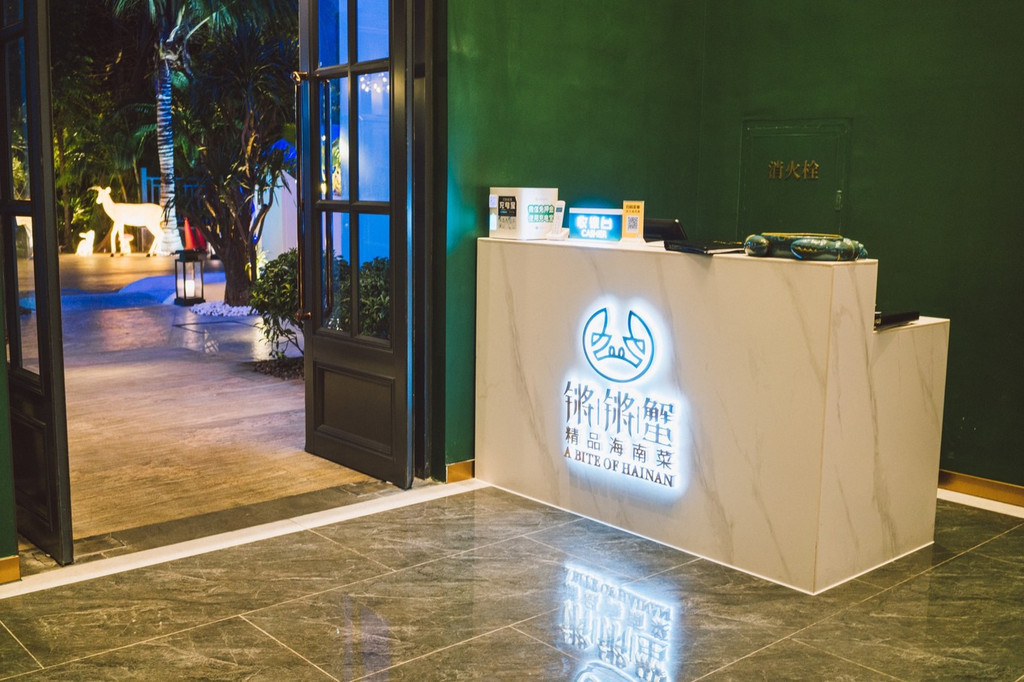 晚上8点到了这里,海角院子小桥流水的就餐氛围,大悦洋锵锵蟹的建筑风格很独特,主要都是绿色,干净整洁的就餐环境,前台的小姐姐很热情地接待你!