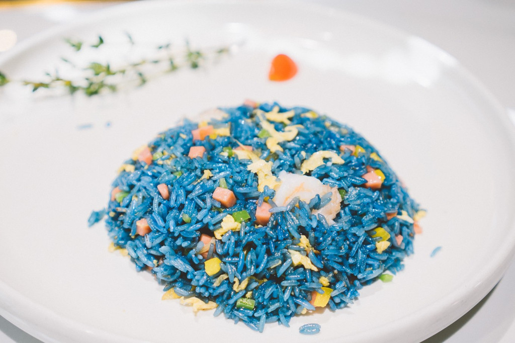 一盘蓝色的炒饭,这是最色彩丰富的一道菜了,你看看都是由什么配料组成的呢?