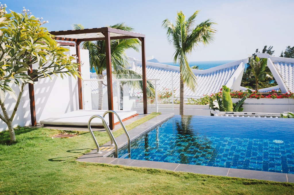 中间的泳池是最特色的一块,一楼就是直接通向泳池的房间,阳台就可直接下水。