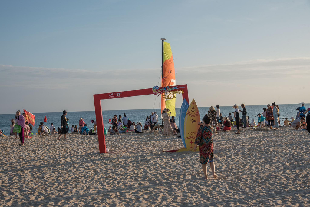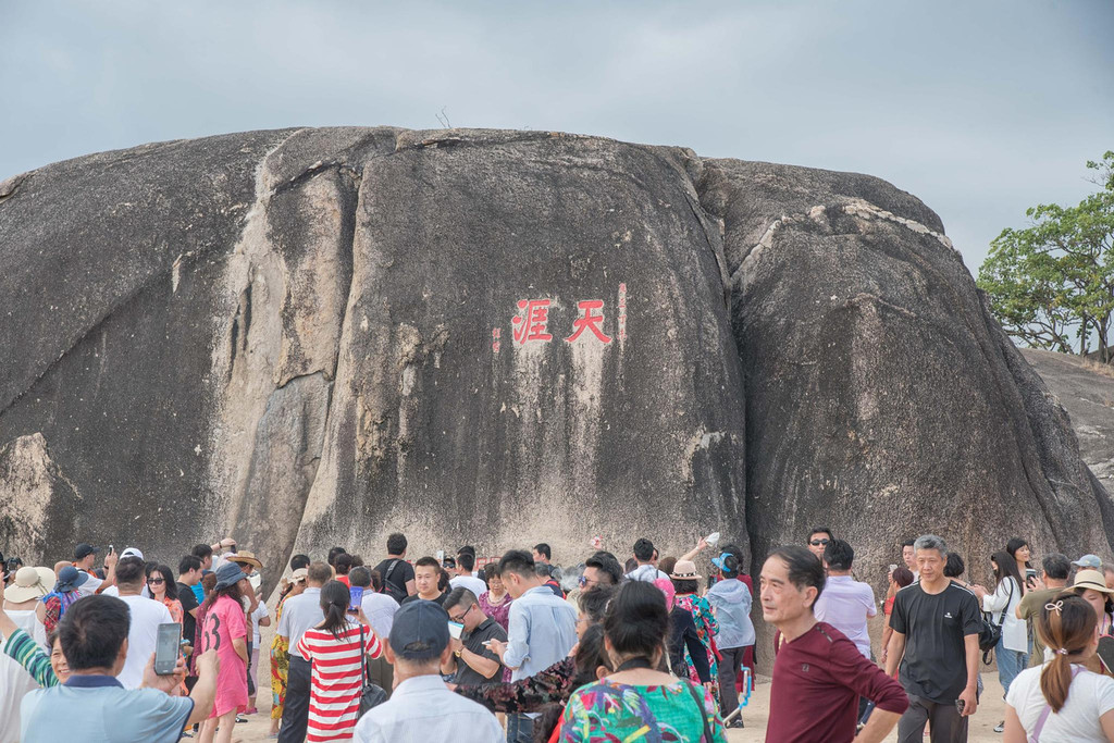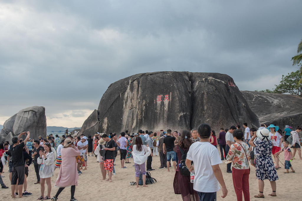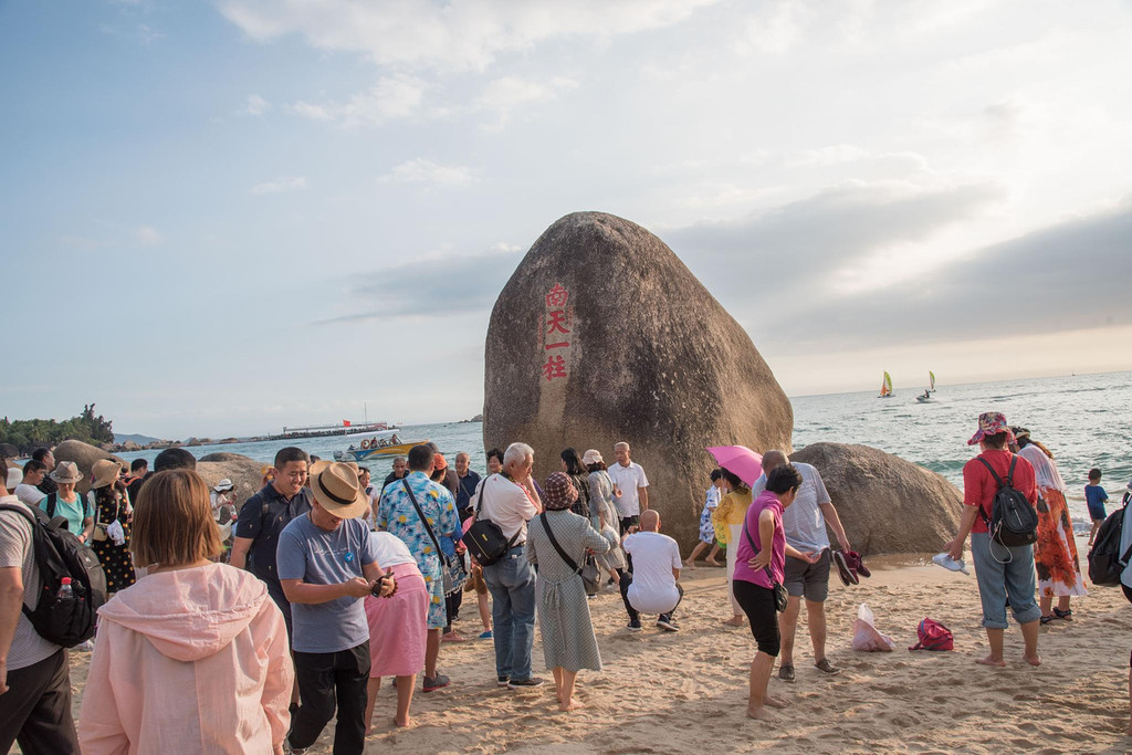 一到目的地,满眼都被景区海湾沙滩上大大小小百十块耸立的岩石所吸引,“天涯石”、“海角石”、“日月石”和“南天一柱”突兀其间,天涯石和海角石象征着平安与幸运,南天一柱又被称为“财富石”,日月石象征着爱情。