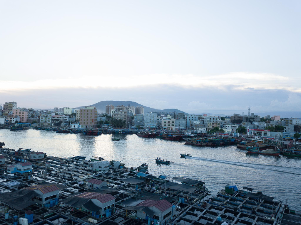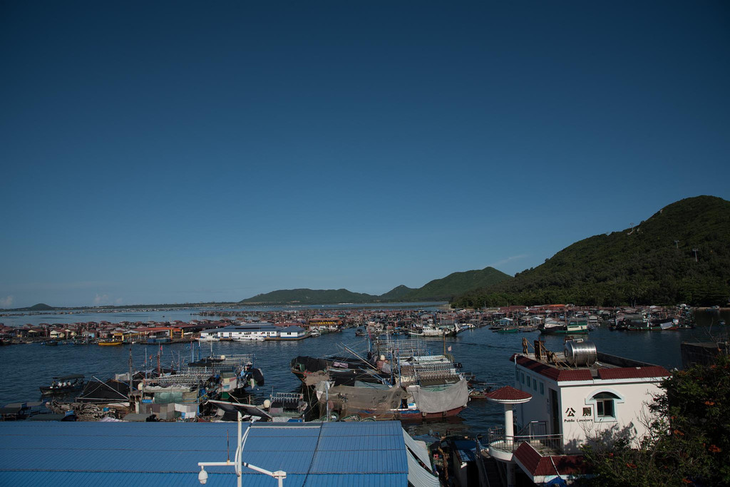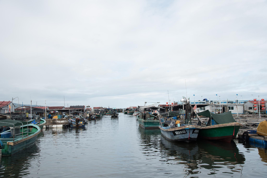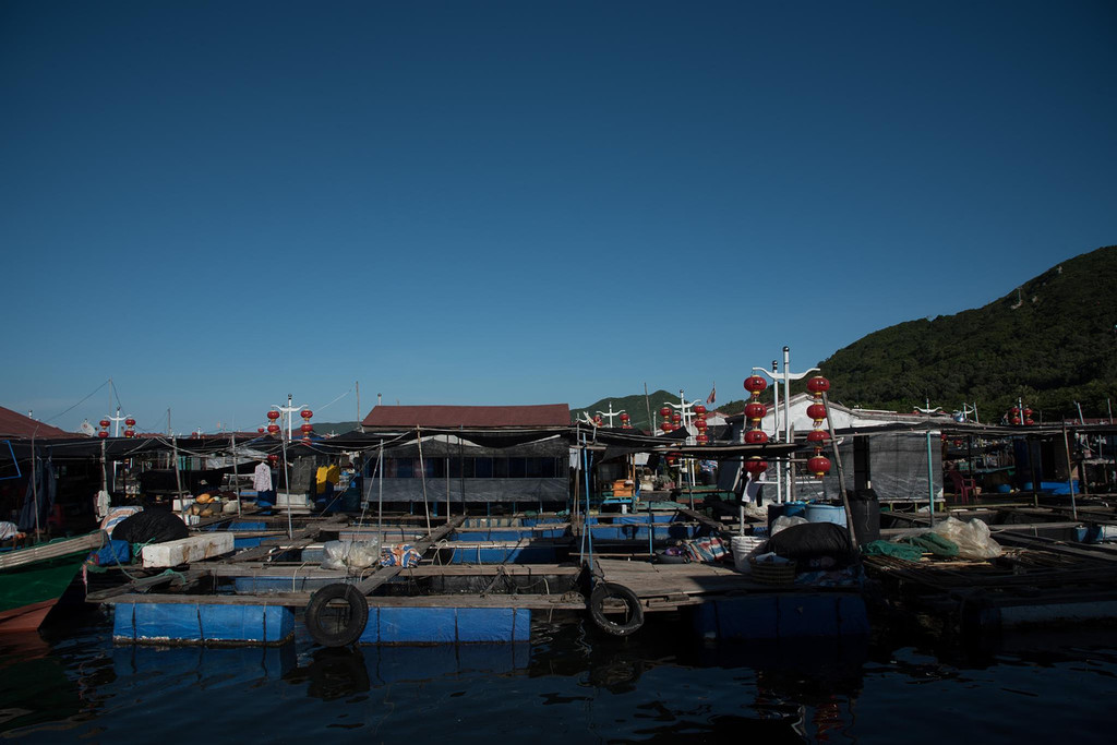 这里三面环海,风光旖旎。小海港坐落着一千多户的疍家人,他们世代生活在海上,700年来代代相传,从码头望去,冬眠宽阔的新村港上密密麻麻浮着一大片小木屋,每座房子的四周都浮着呈井田状用于养殖水产品的网箱,就是所谓的“渔排”。千家渔排聚集在一起,如同水上城市。
