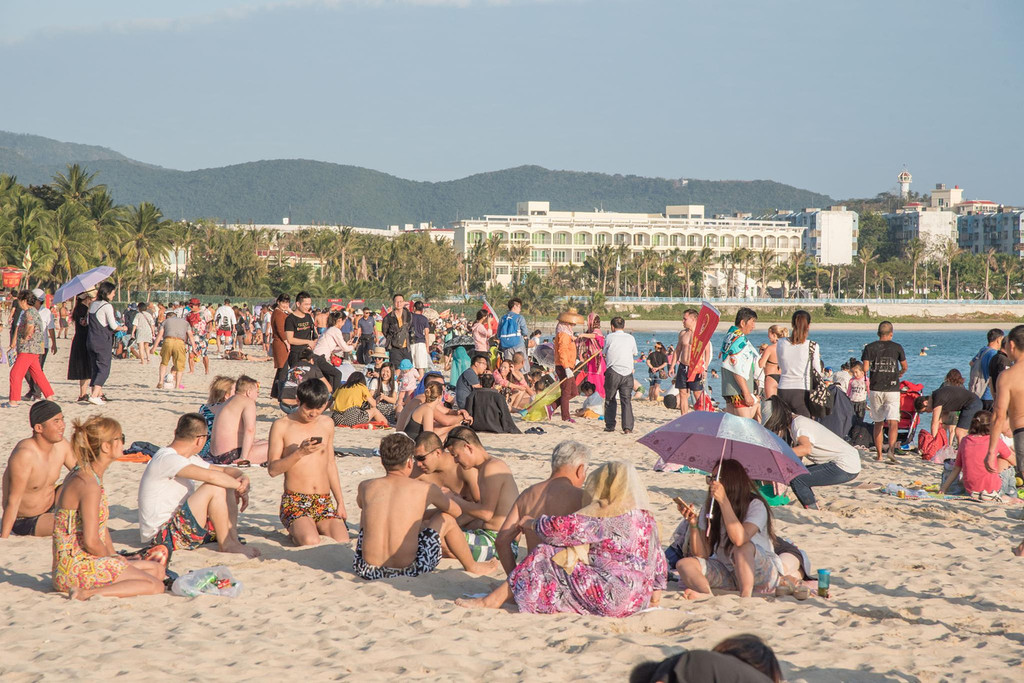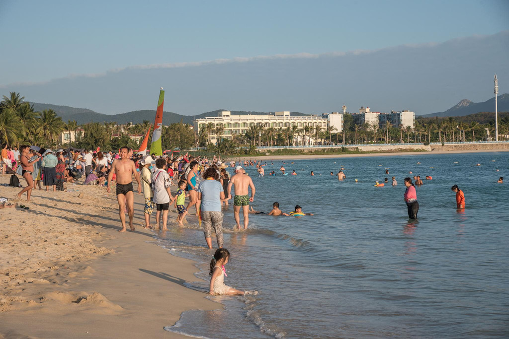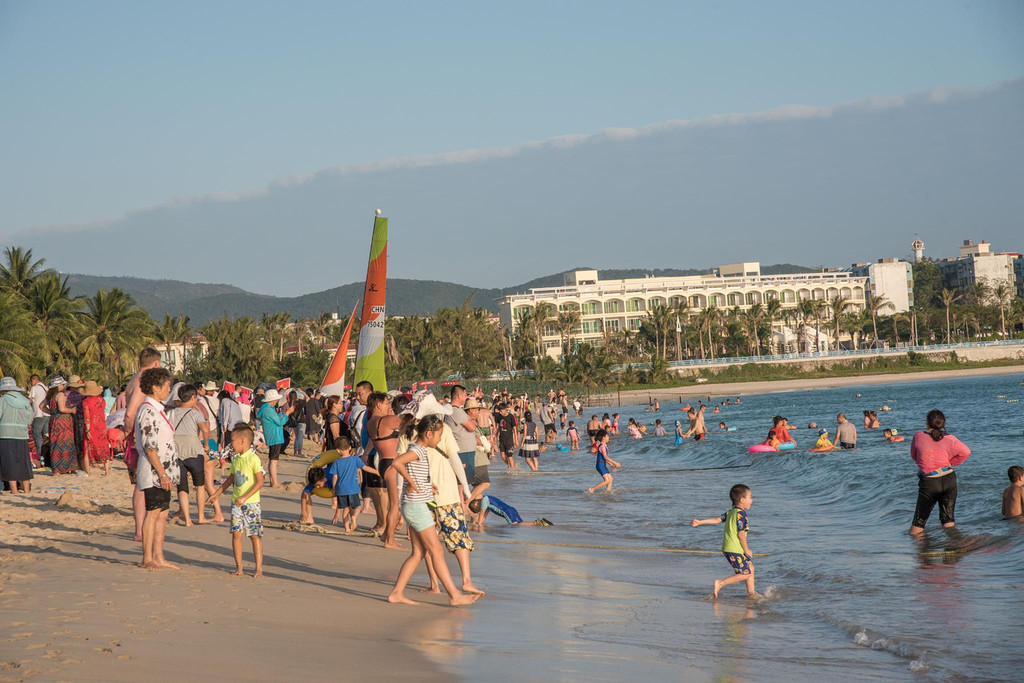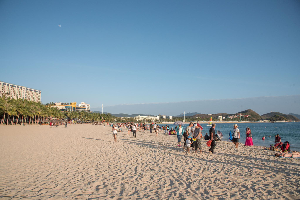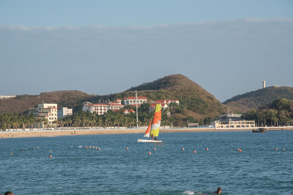 大东海位于三亚市的榆林港和鹿回头之间,距市区仅3公里。大东海海滩水质不错,海滩距离酒店也较近,有的酒店的电梯直接通向海滩,难怪许多人推荐大东海住宿,是有一定道理。当天天气很好,蓝天白云映衬着碧水,椰树和楼宇镶嵌着海滩,游客数量很多,沙滩上稍显拥挤,不过也不是多到不能忍受的地步。