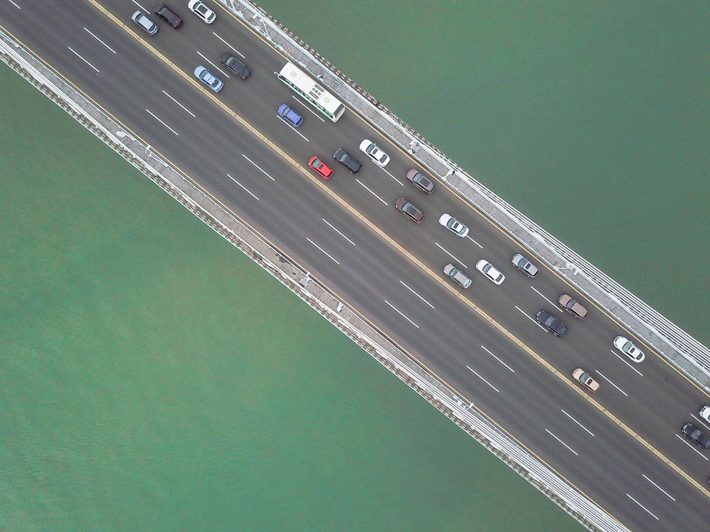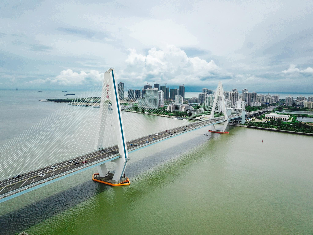 在暖黄色的夕阳照耀下,大桥的拉桥结构十分惊艳。桥两侧一边是大海,大海旁边是万绿园,一边是河口,河口旁边是美丽的海南大学。海面上不时驶过白色的船舶,增添了风光无限。