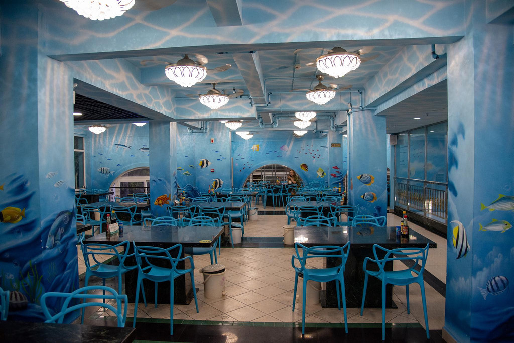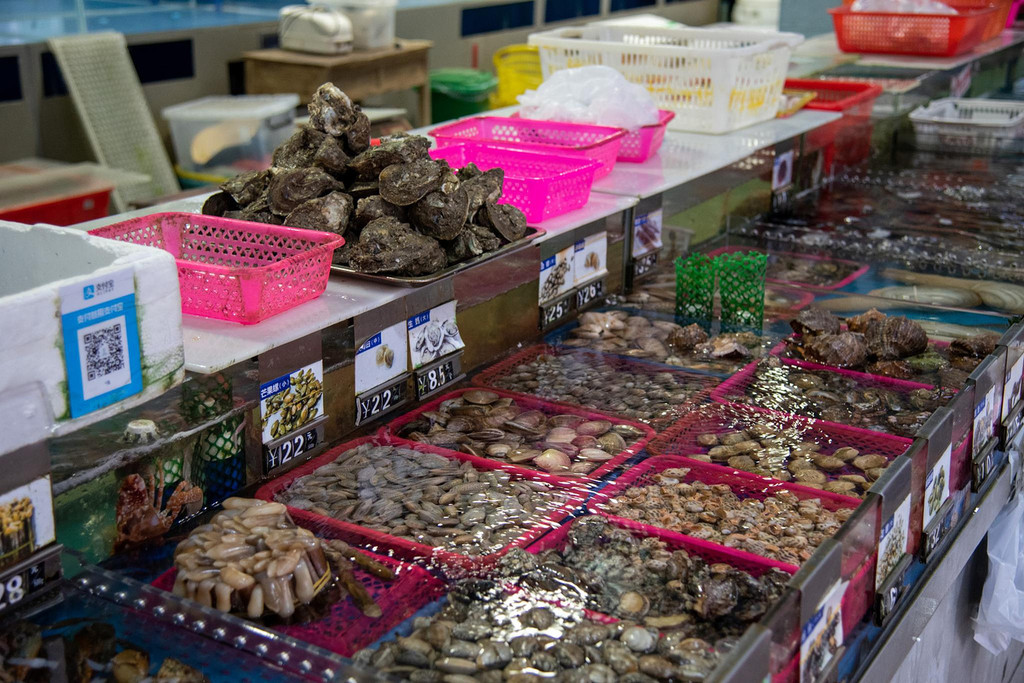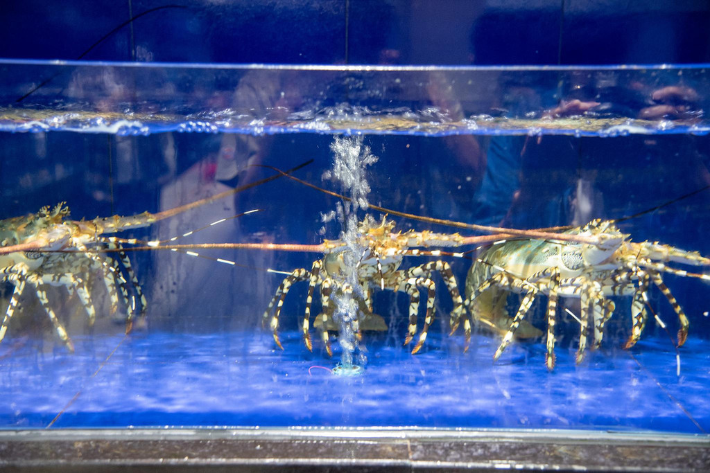 这可以算得上三亚最大的海鲜加工综合广场了,蓝色建筑加蓝色的装修加鲜活的海鲜,让人感觉仿佛置身于大海。餐厅就在三亚湾的海边,可以在三亚湾看完日落,再进店吃海鲜。小海豚海鲜广场可以直接点菜,也可以在一楼购买海鲜加工,我决定自己在一楼挑选,体验下三亚买海鲜的乐趣。