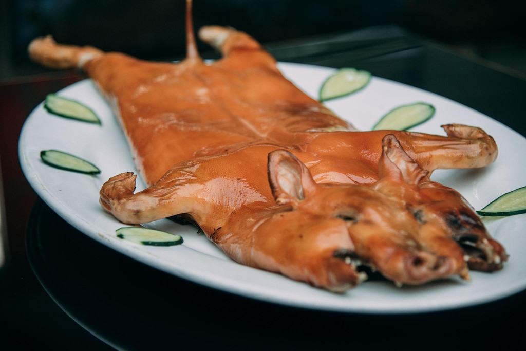 烤乳猪是很讲究的,不能太重,一般每只在二十斤以内。师傅将宰杀好得乳猪剖开、碎骨、上号作料,然后放在炭火之上用文火烤。一边不停地翻动,一边不时地往猪身上涂花生油,据说这样可以使烤出来的乳猪皮脆而不起泡,增色又增味。烤一只乳猪约四五个小时,烤出来的乳猪全身焦黄,色泽诱人,散发着浓郁香气,让人不禁食指大动。夹一块入口,轻轻一嚼,脆响的“咔哧”声响个不停,令人回味无穷。