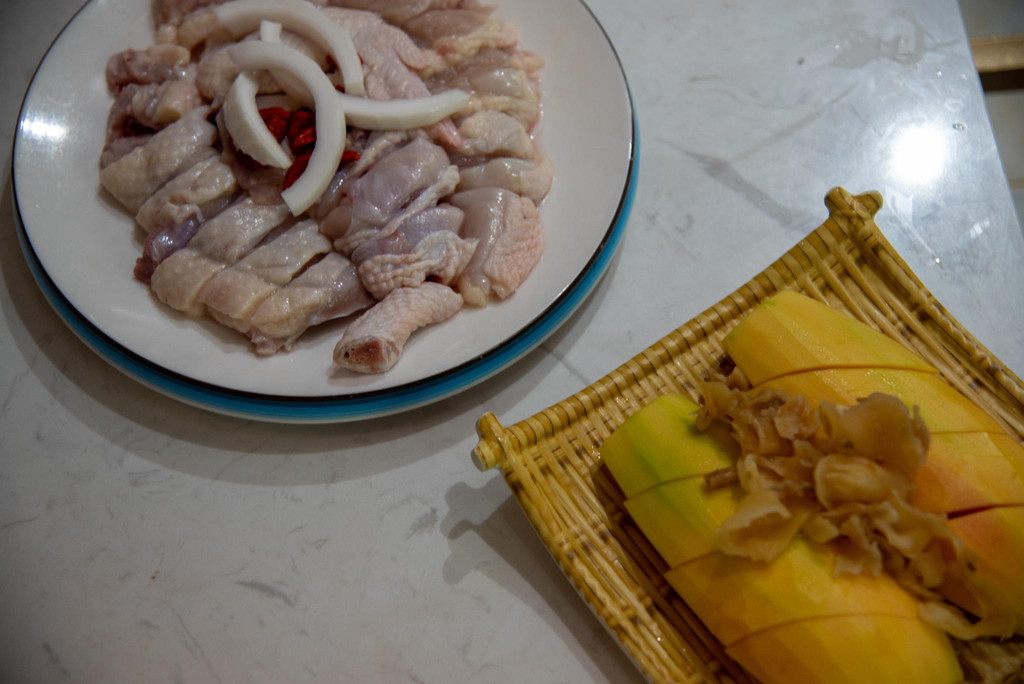 鲜甜的椰汁被店员倒进锅中,再加上一瓶矿泉水,成就了椰子鸡的汤底。