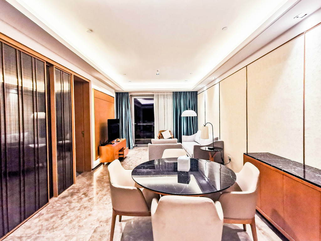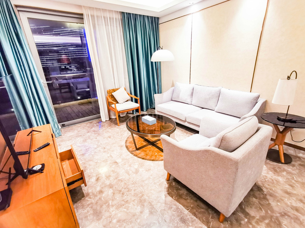 先来看看这家酒店吧,酒店位于三亚海棠湾亚特兰蒂斯旁,可以一键打卡亚特兰蒂斯的水族馆水世界哦。不过最关键是这里环境超好,我们三个人,订的是一间亲子套房,其实就是两室一厅的公寓房,一个主卧,一个次卧,两个卫生间,一个大客厅,一个大餐厅,餐厅旁就是开放式的大厨房。当然,超大,且带有浴缸的大阳台,可以坐在阳台上看海,看这神圣的亚特兰蒂斯。