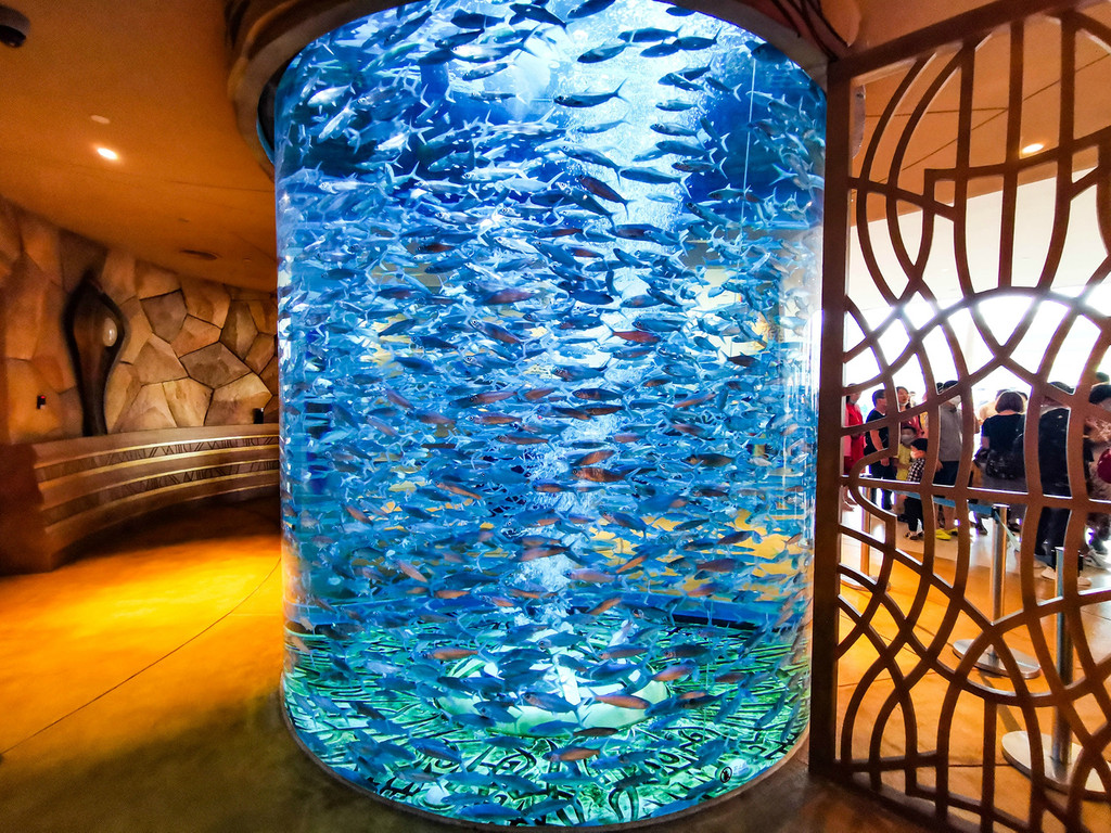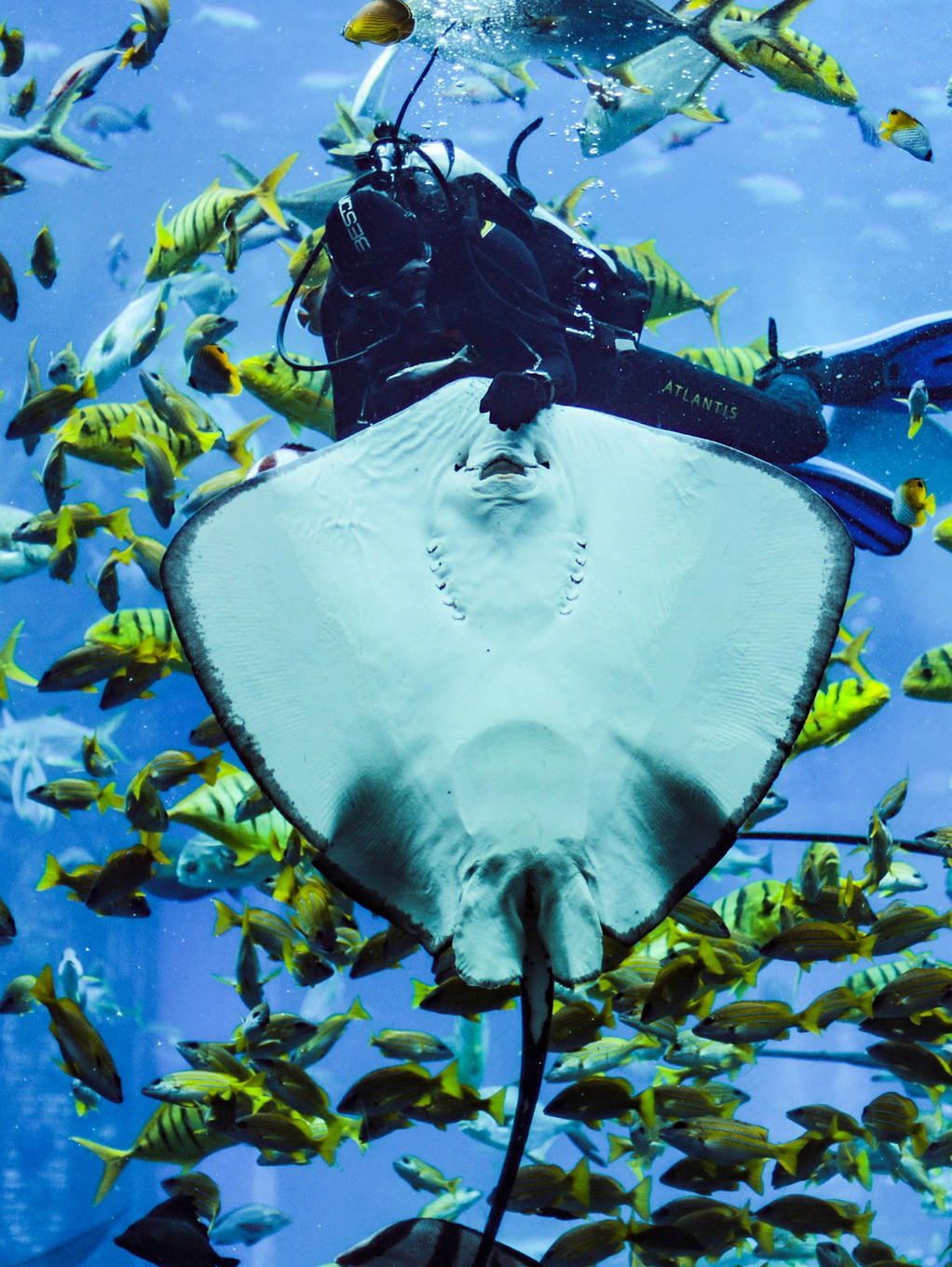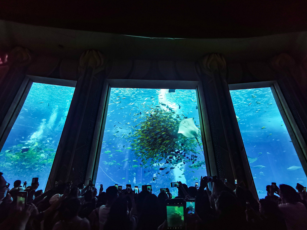不想买门票,也能看到水族馆里面那个巨幕水族宫哦。进入亚特兰蒂斯酒店的大堂之后,右转就能看到这个巨幕水族宫。只要你不进去里面参观其他水族馆,这里都不收费,随便拍照。