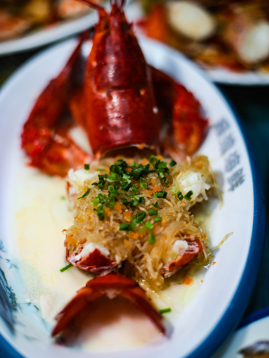 我最爱的还是蒜蓉龙虾,百吃不厌的感觉,当时挑选龙虾的时候,服务员把大龙虾放在地上,它还超级活跃,端上来以后,一只红色的龙虾被蒜蓉和粉丝包裹,肉质紧实弹牙,蒜末加粉丝和龙虾肉一起放进嘴里,那是一场华丽的盛宴。