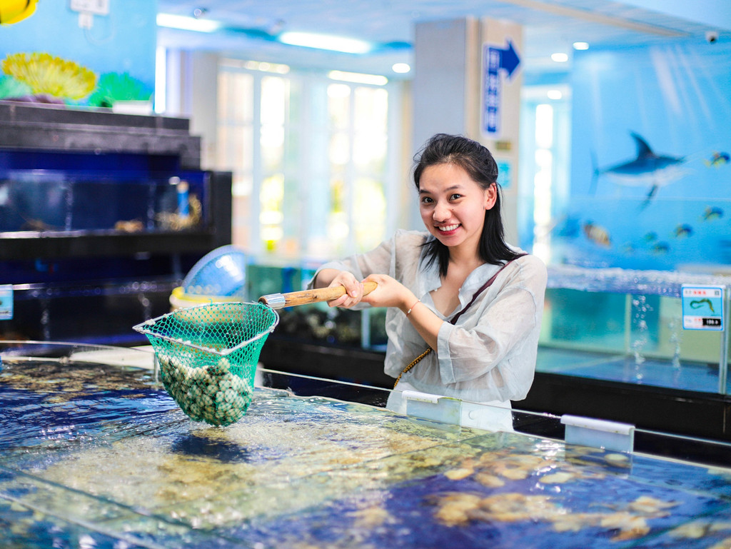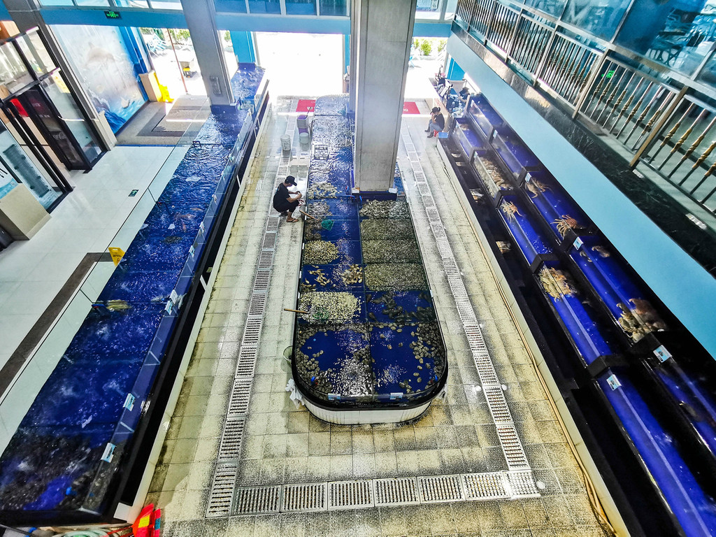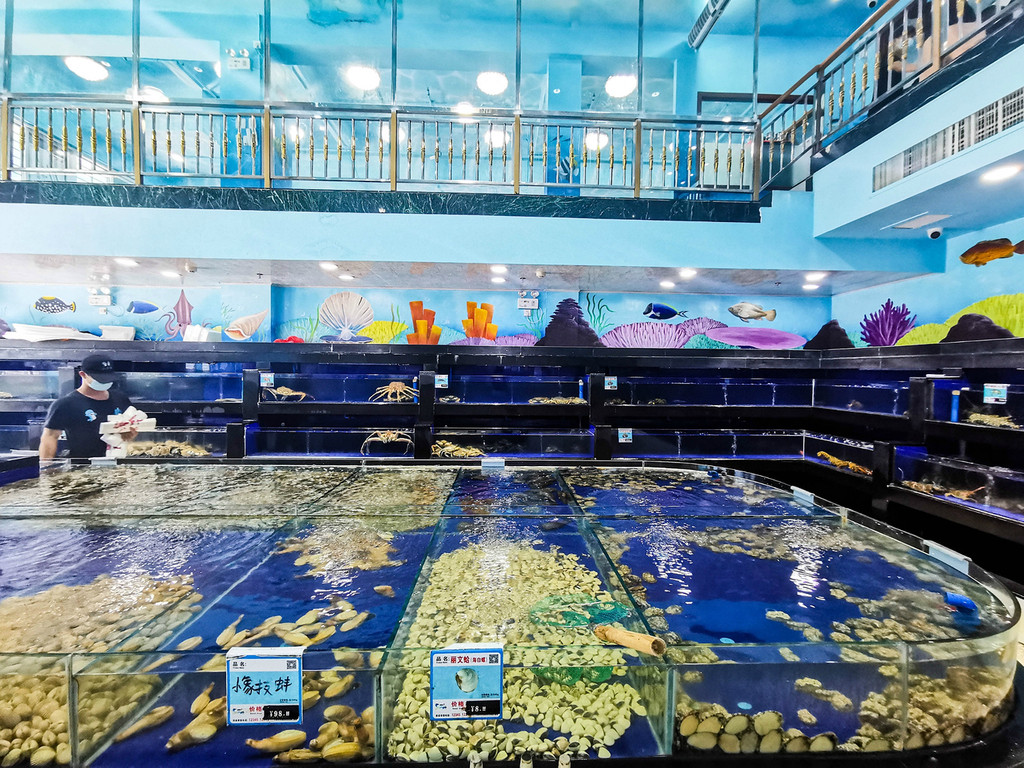 走进来,首先是一个海鲜选购区域,诺大的厅,摆满了大小不一的鱼缸,这里都是活蹦乱跳的生猛海鲜,看着就很过瘾,我们忍不住自己亲自动手选起来,来一次亲密接触。