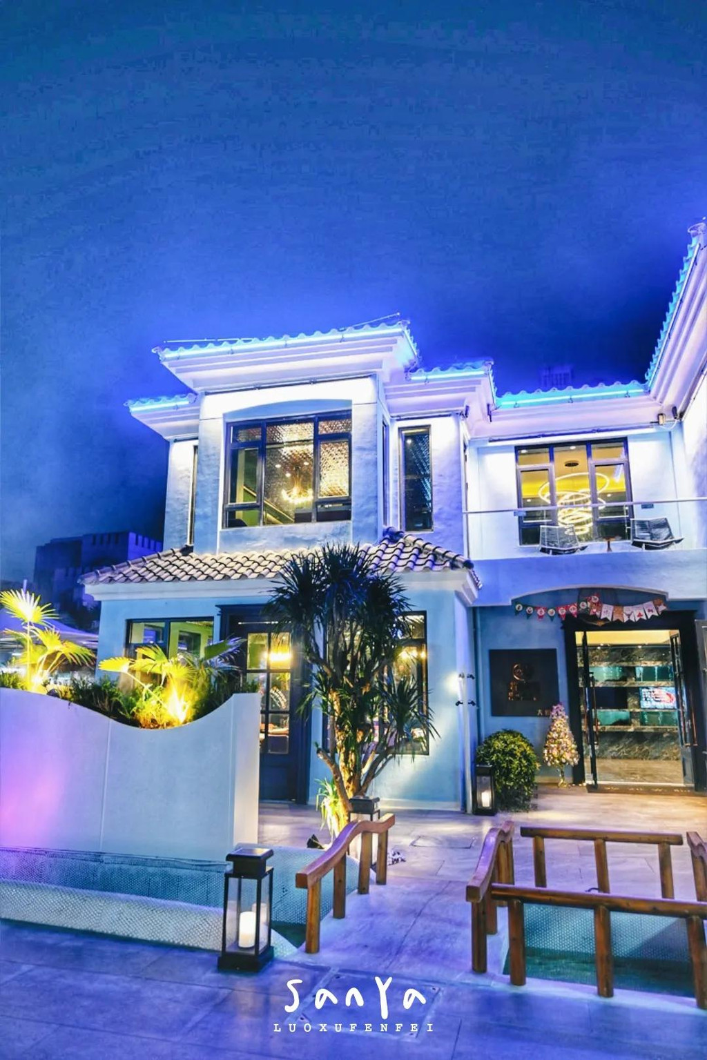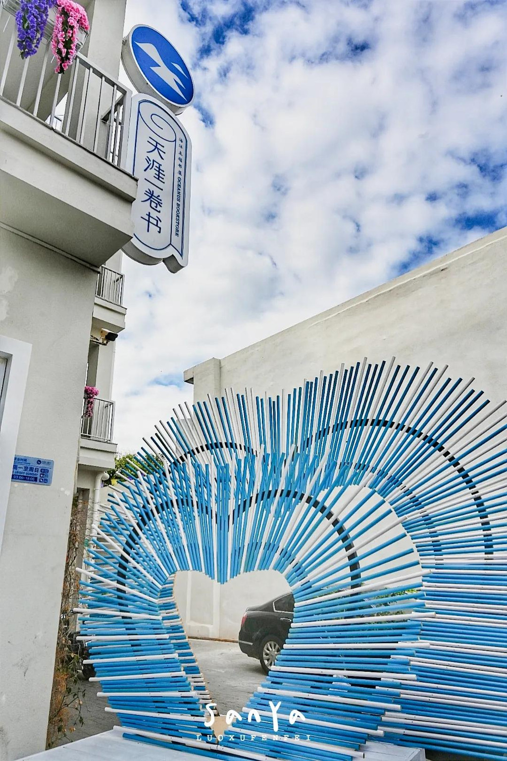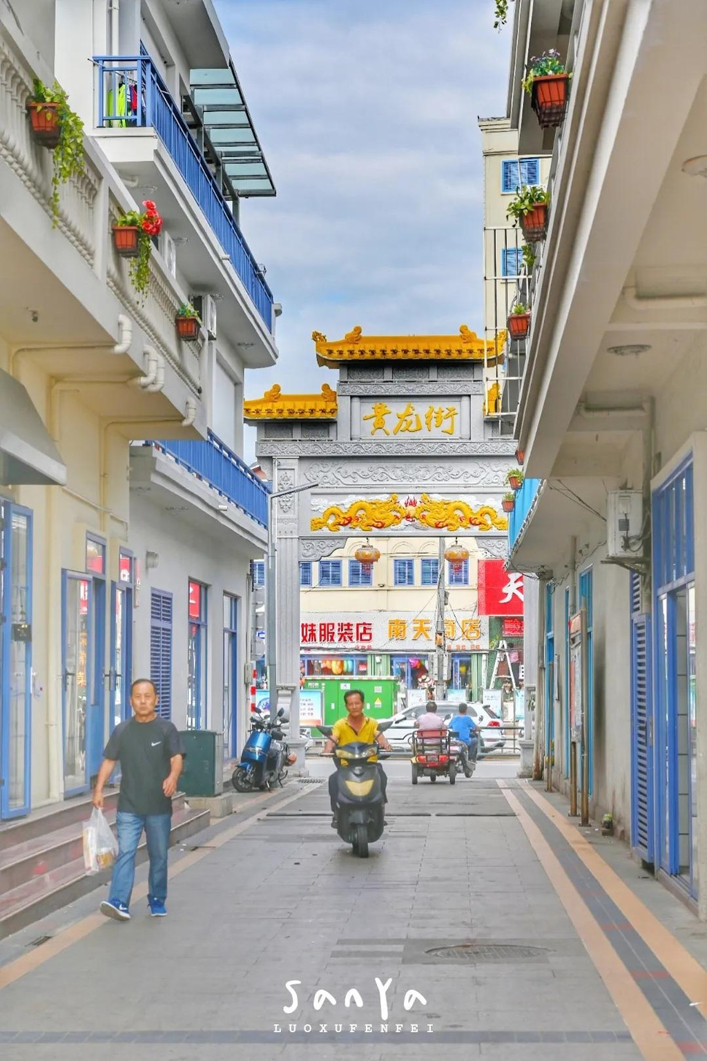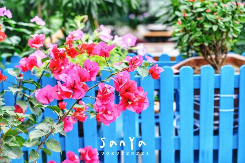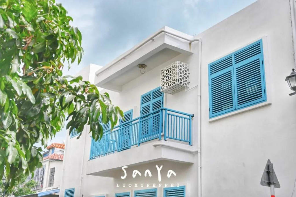 这里被誉为三亚的“圣托里尼”,蓝色的窗棂和门框,白色的墙体,确实有点希腊风,不过细看就会发现建筑和设计都是偏南洋的风格,百叶窗和三角梅,都让我感觉仿佛是在新加坡或马来西亚的街上闲逛。