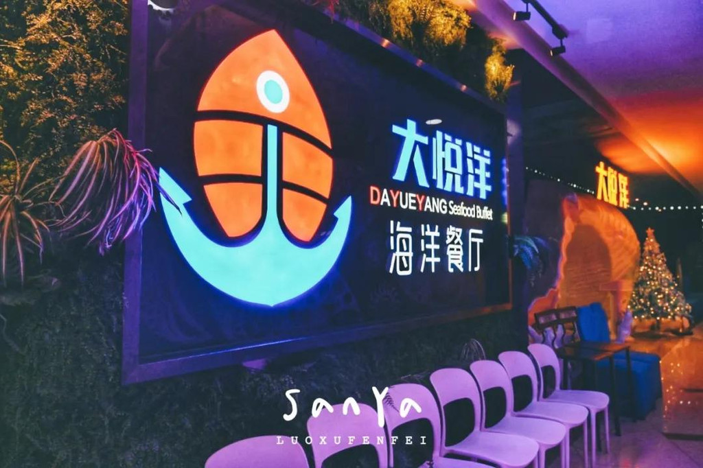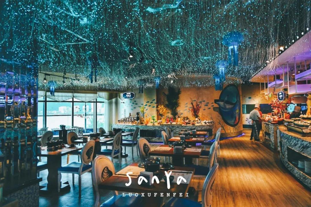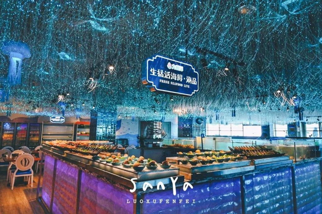 大东海度假区是来三亚必到的一个区域,这里集中了三亚老城区的商业市场,还有许多美味的海鲜和美丽的海景,比如在大菠萝1号港湾城,因为本地居民也逛,所以能以便宜的价格淘到不少好东西!大悦洋海洋餐厅就在1号港湾城4楼,观景电梯隔壁,自助午餐只要288元/人,有室内和室外的区域,坐在室外可以享有大广角的一线海景~在室内就餐则仿佛身处充满星光奇景的海底世界,氛围极好~