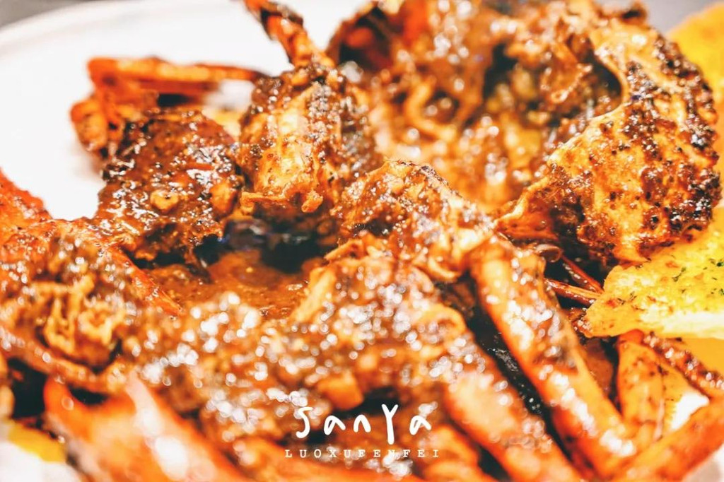 套餐的重头戏是螃蟹,他们家的螃蟹做法很多,主推的是四种,可以选择自己喜欢的口味,服务员向我推荐了经典招牌的黑胡椒做法,刚端上来就有一股非常浓重的黑胡椒味,特别香!厨师还专门搭配了蒜香面包,可以就着胡椒酱吃,味道相当好!螃蟹经过处理之后其实不用很费力就能把蟹壳剥开,立刻就能看到里头丰盈的蟹膏和厚实的蟹肉!锵锵蟹选用的食材十分新鲜,做法也很有东南亚的味道,让我们在三亚有了仿佛去到东南亚的美食体验~