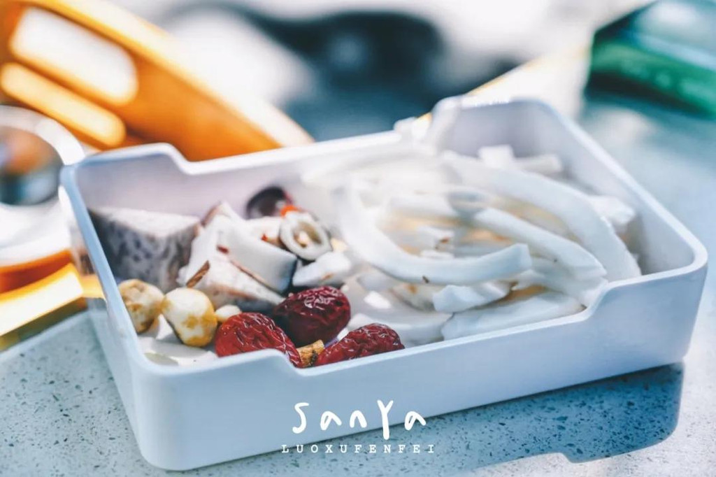 他们家椰子鸡的鸡肉选用的是长年在椰子树下奔跑自由生长的文昌鸡,肉质更加紧实,吃起来口感更好,用的配料(包括调料)也都取材于海南当地,他们家的调料种类相当多,其中一部分在平日去的火锅店里并不常见,极具当地特色!老板深谙料理的真谛,食材新鲜才是最重要的,用了好的食材,菜的味道基本就差不离了~