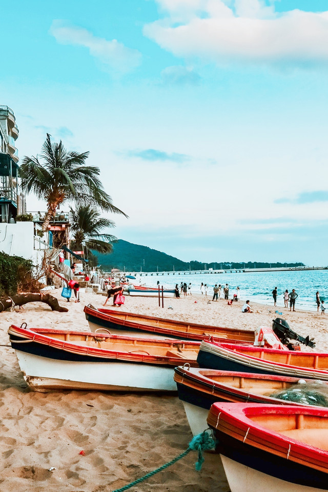 天涯镇是适合拍照的巨佳场所,所以你会看到来这里拍照的小姐姐好多呀,我觉得早上和下午四、五点的时候最适合拍照,你从小巷子走到大海,巷子尽头的沙滩上都停放着渔船,耶树、沙滩、渔船、大海...构成了成为一幅超美的画卷。