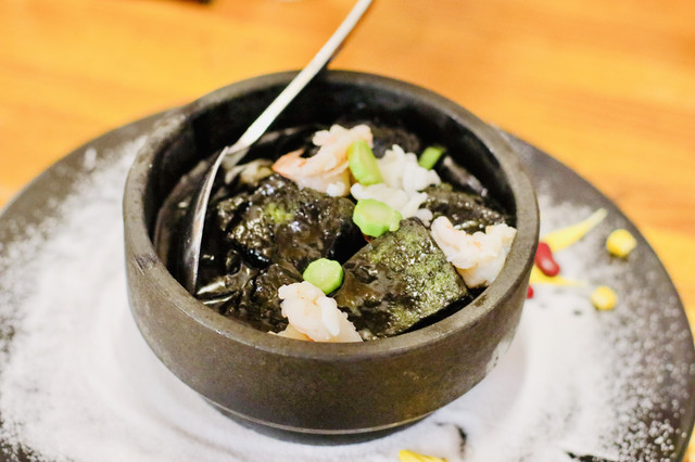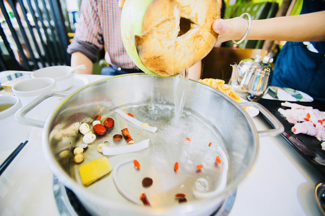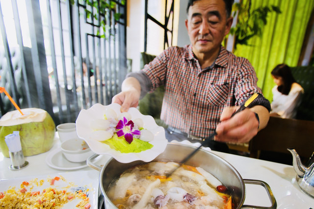 这一锅椰子鸡不仅吃鸡,你也可以像吃火锅一样涮烫万物,新鲜的肉类、海鲜,各色蔬菜样样都有。要说一句,一般椰子鸡里会放的香芋和竹笙,在萌哒哒吃那个口感可是更上一层楼,香芋更加软糯、竹笙更加脆嫩!