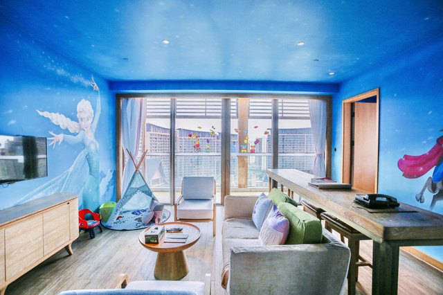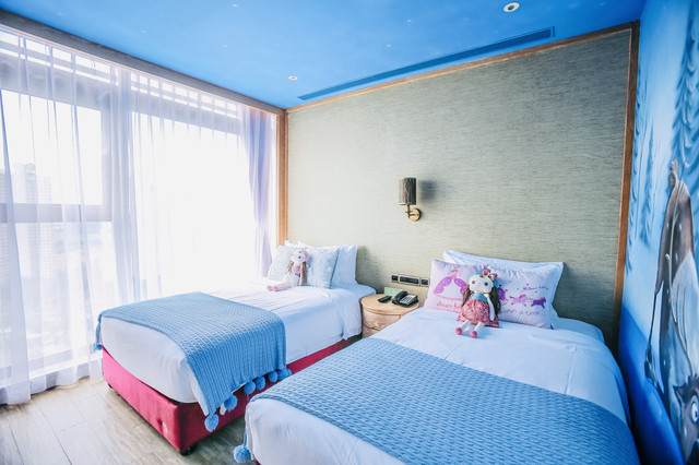 棕榈王国共有3种不同的房型,这次帽帽和老爸住的就是小公主套房。走廊是粉色的,房间竟然是冰雪奇缘主题的。房间里的家具、布艺、寝具、墙绘、装饰品以及系列儿童用品等等,都按照不同的冰雪奇缘主题而独家定制的,采用纯天然环保材料。此外,