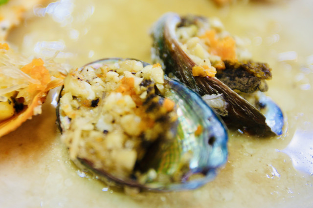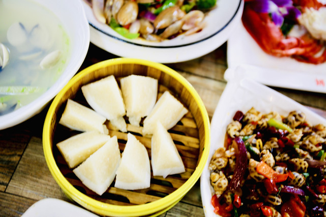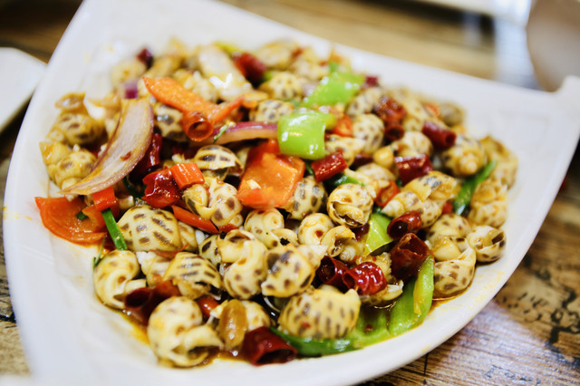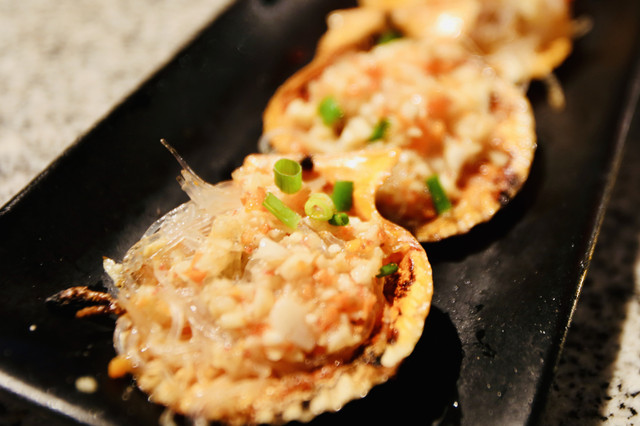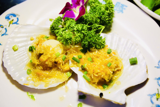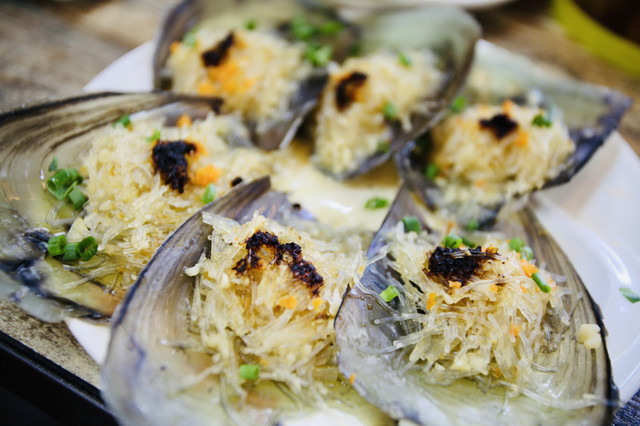 蒜蓉粉丝蒸扇贝里放的粉丝和蒜蓉都很多,蒜香浓郁,吃起来就停不下!帽帽以前没吃过芒果螺,这次第一次尝试,瞬间被圈粉,下次还想吃,螺肉鲜嫩,辣味十足,很下饭!