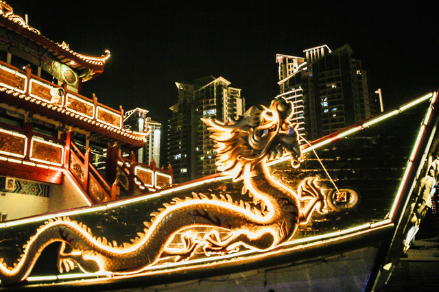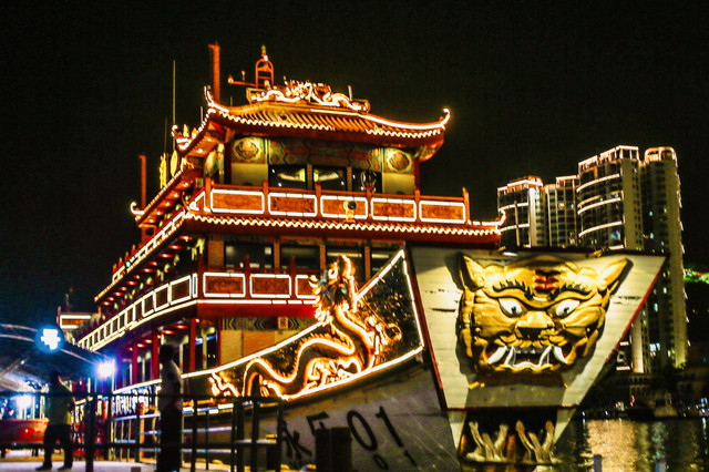 当永乐号游轮带着游客出海的时候,游船灯火通明,一时之间有种穿越的感觉,游船一层演绎着梦回大唐的剧目,似乎当时郑和下西洋的场景再现眼前。