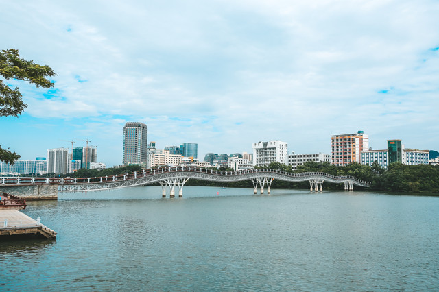“三亚市区的步行桥,因为形状像彩虹也叫彩虹桥,又被誉为“情人桥”,它横跨在三亚河上,是连接河东和河西的通道。白天在桥上看河水碧波荡漾,河边红树林丛中白鹭和海欧点点;晚上在桥上看桥身灯光弯弯曲曲七彩变幻,三亚河两岸夜景非常漂亮。如果说三亚各景点的“情人桥”是节日大餐的话,那么市区步行桥则是温暖可口的家常菜了。”