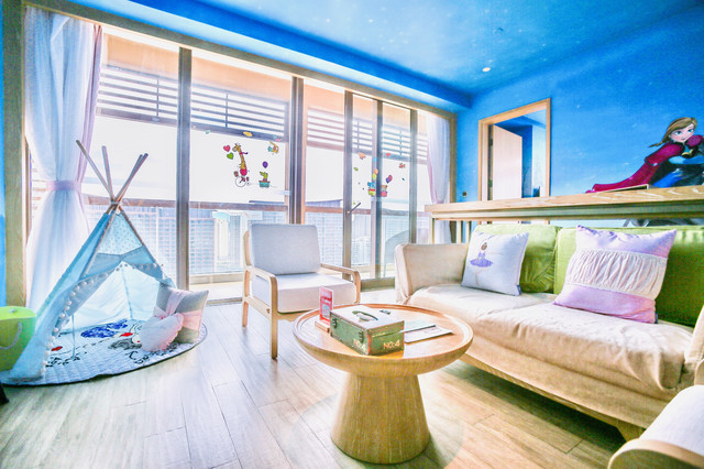 每个房间里内都设置了一个亲子客厅和游戏区域,公主套房里的是一个小帐篷,和艾莎公主挨在一起呢~卫生间里的牙刷超级可爱,真的是给小公主准备的呢!