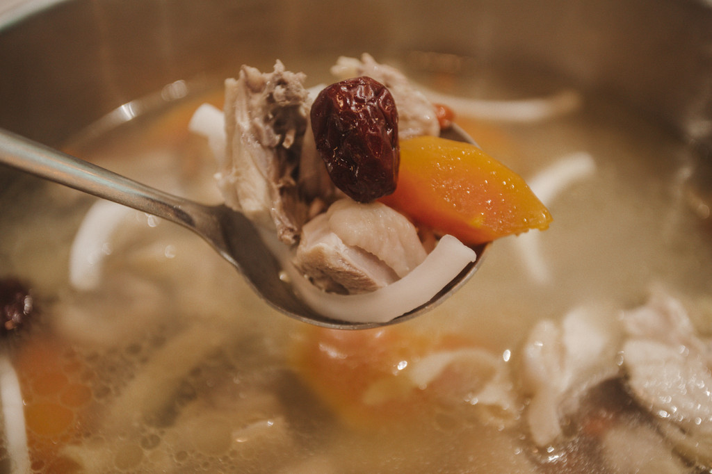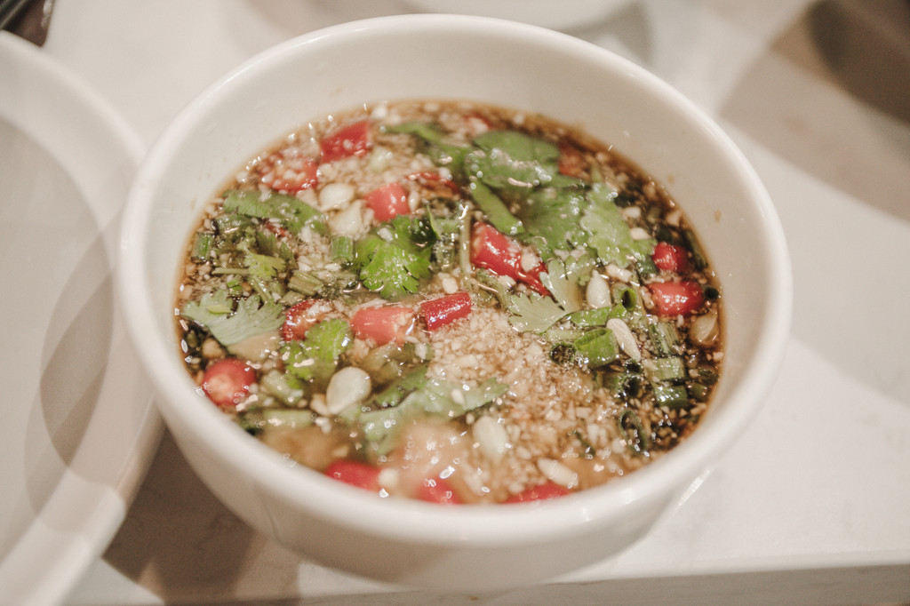 花椒木瓜椰子鸡汤,开吃之前先喝汤,整个人都舒服,然后再蘸汁吃鸡肉,鸡皮Q弹,鸡肉嫩滑;