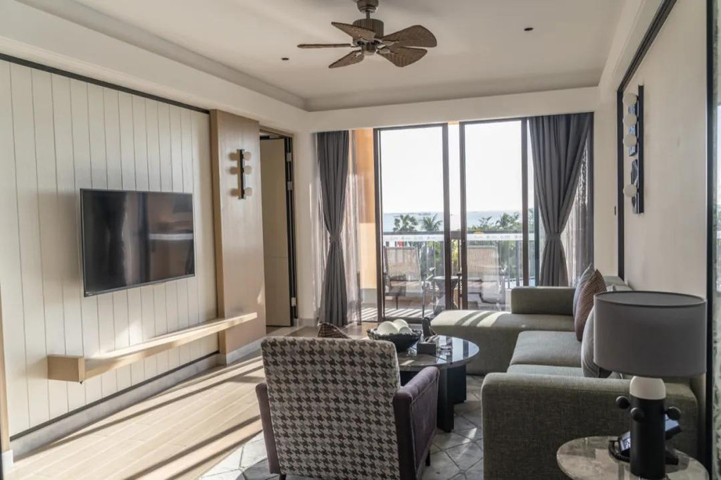 我们住的海景房,推开窗户就能看到波光粼粼的海面。房间面积超出了我的预期,,套房还是香的,客厅卧室做了分区设计,摆放了许多设计感很强的艺术品。