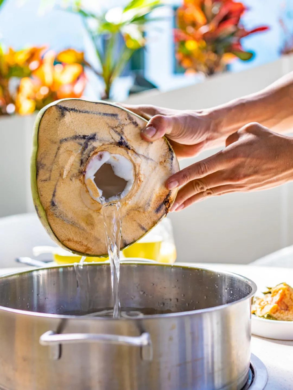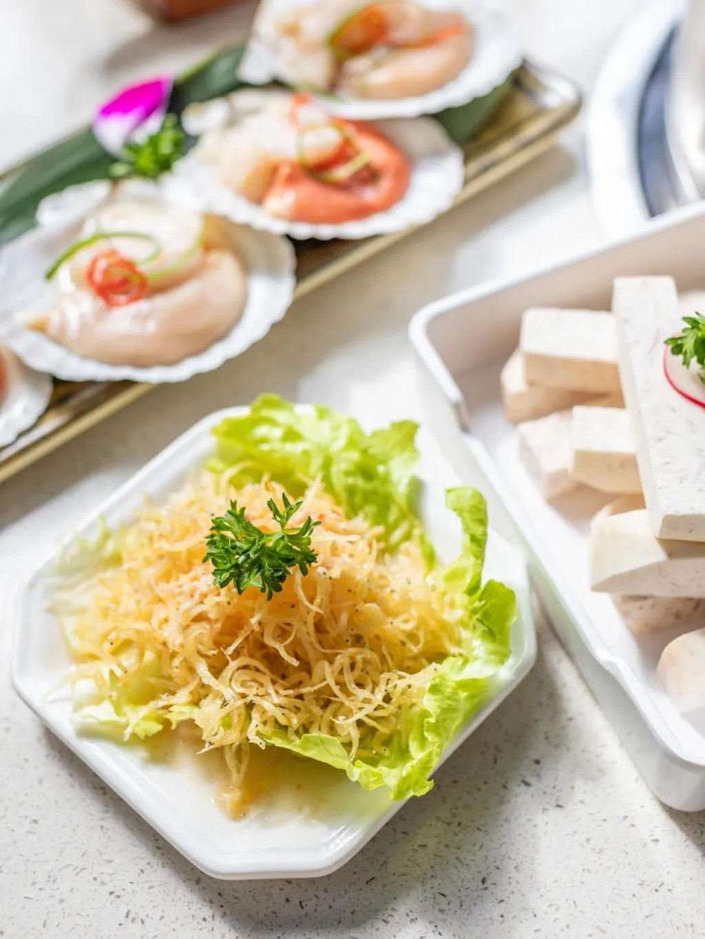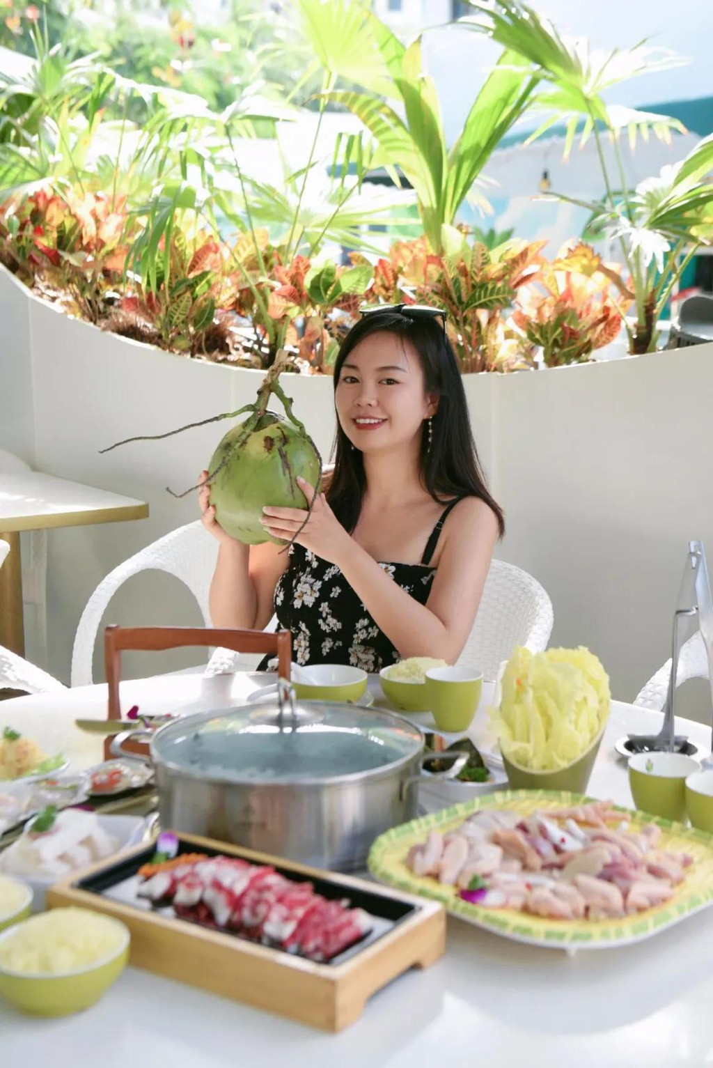 锅底都是用的新鲜椰子水,现开现倒,仪式感也很足。锅里还有椰肉、红枣枸杞等配料,算是一道养生菜!椰子鸡汤味道清甜,喝起来也不腻,个人超爱~
