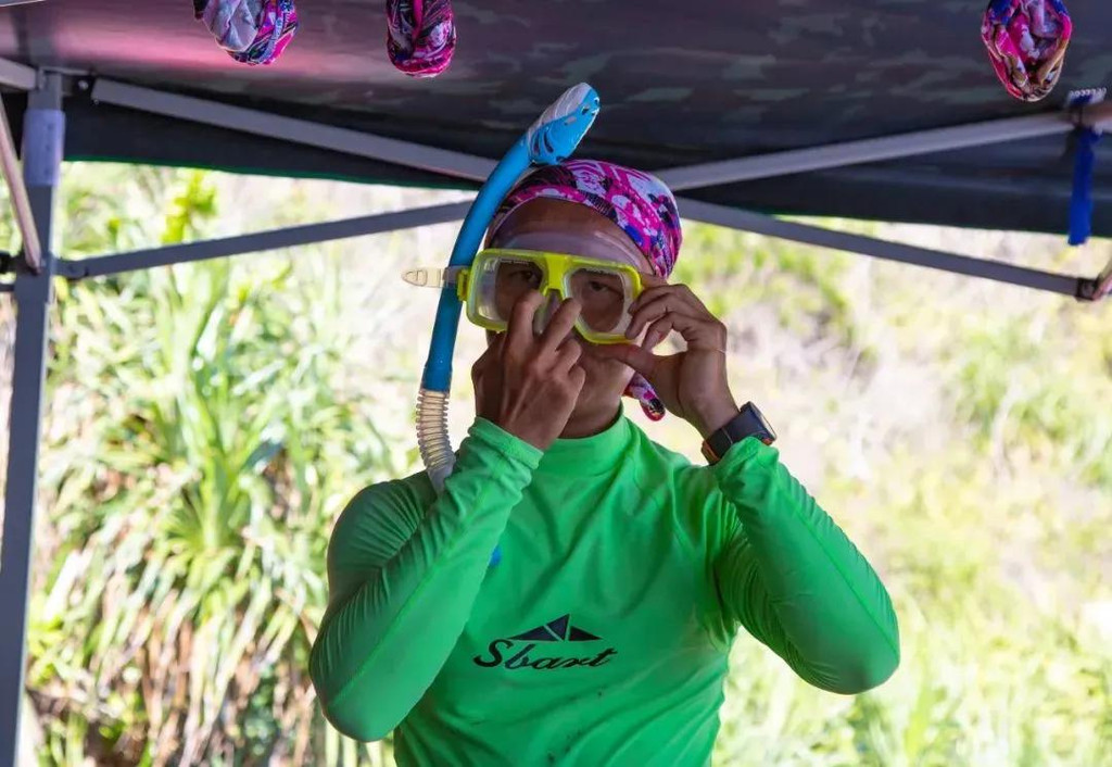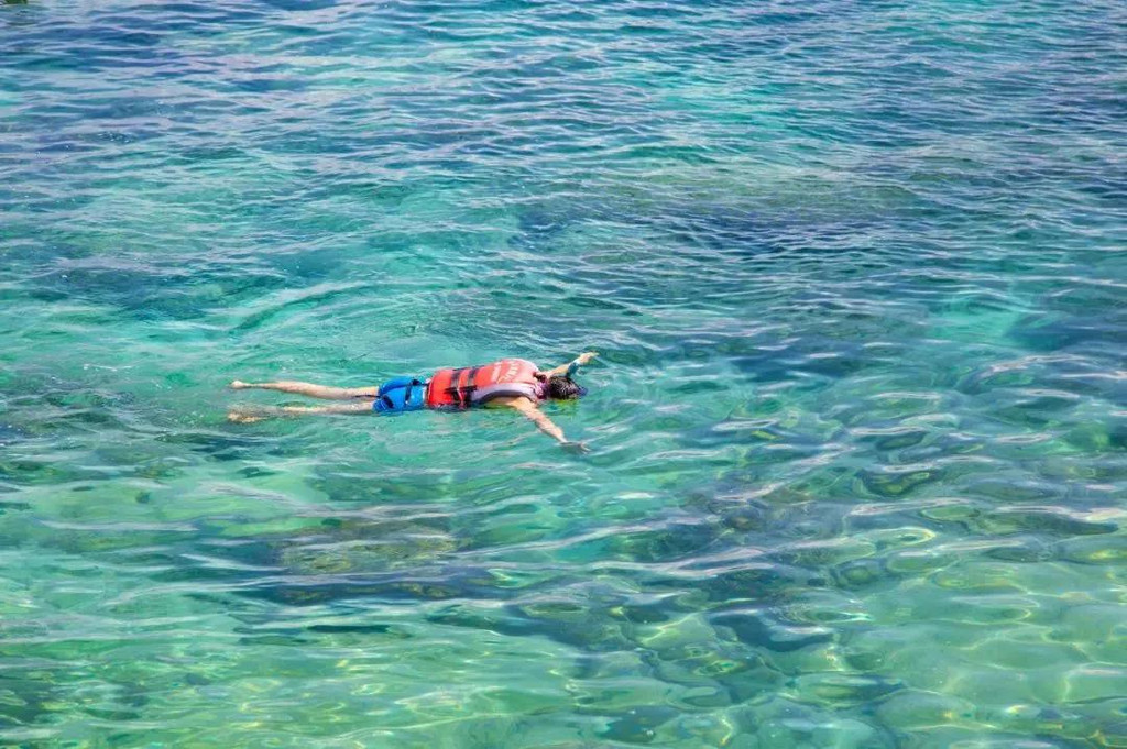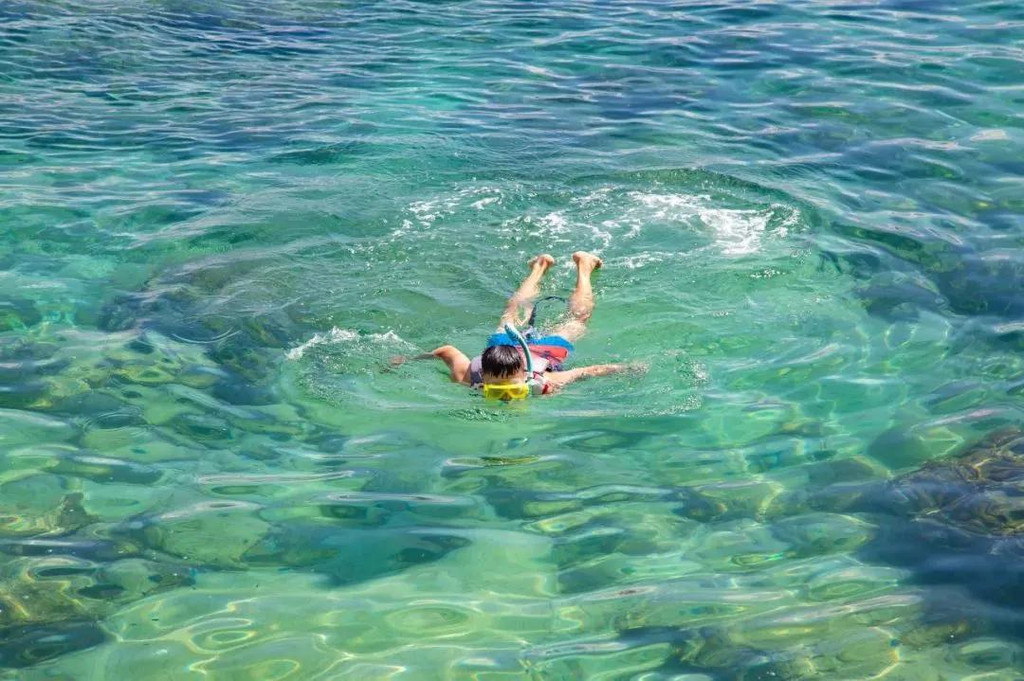 上岛后教练会在第一时间跟大家讲浮潜的注意事项,然后分发浮潜的装备,再带大家下海适应训练。不会游泳🏻的也不用担心,有浮毯拖着,只要把头埋进海里也可以畅游海底世界~