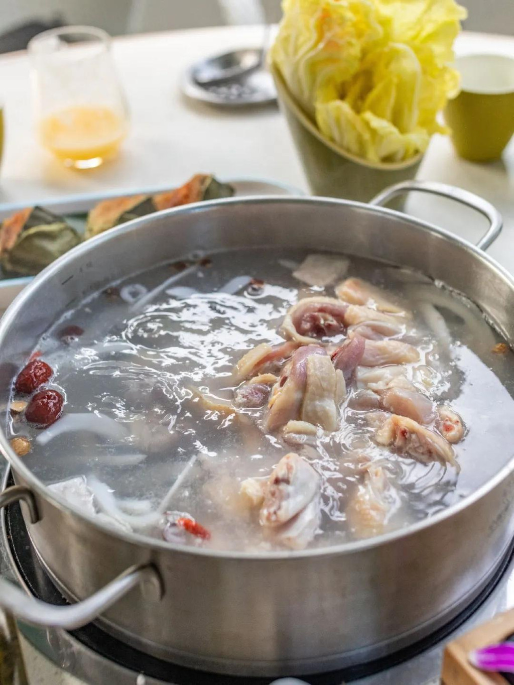 锅底烧开后服务员会来下鸡肉,然后桌上放一个计时器,倒计时三分钟后就能吃。海南本地文昌鸡,煮好的鸡肉细嫩鲜美,不仅营养丰富,也完好地保留了食材本身的原味。