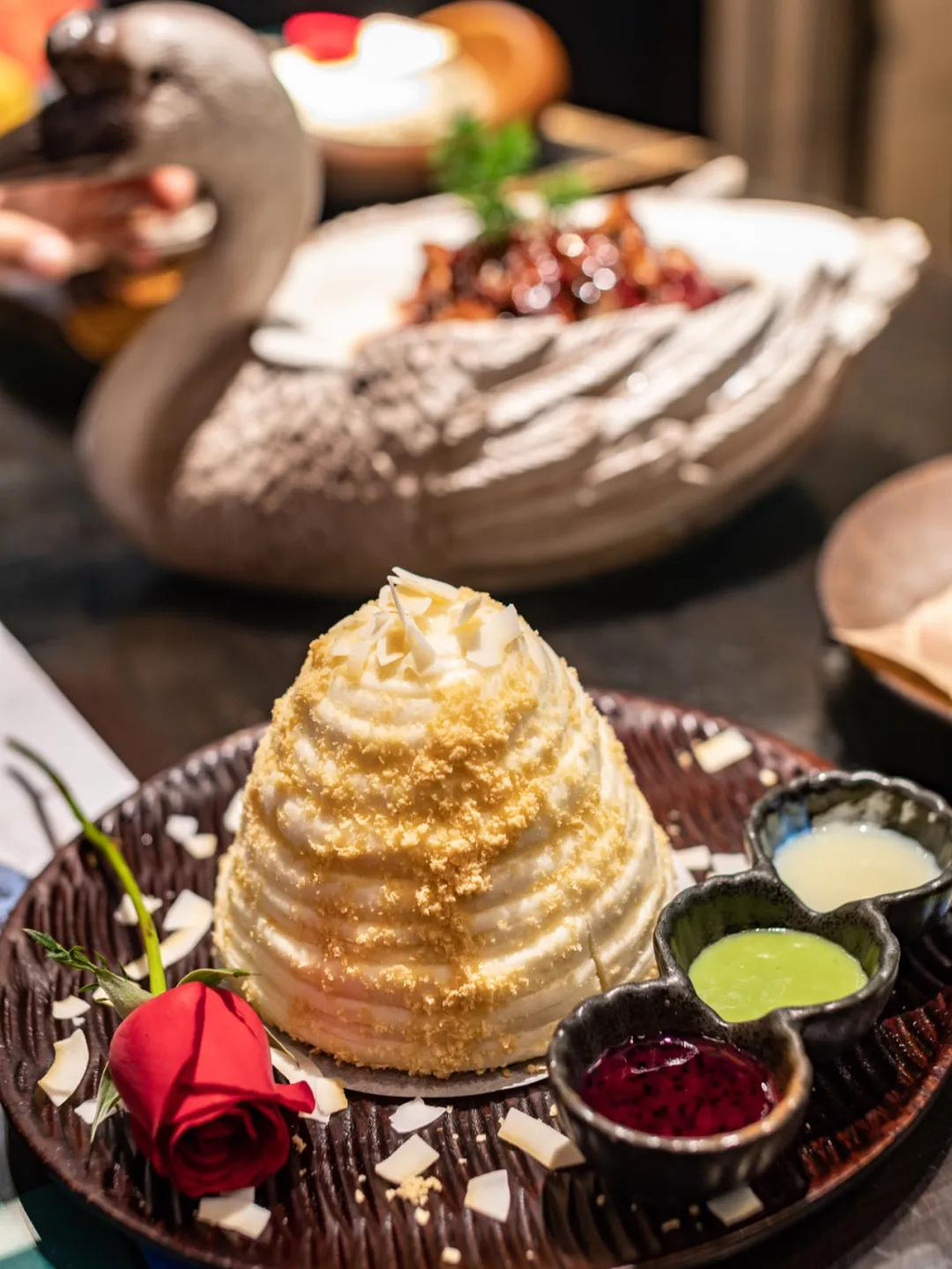 爆品奶香花卷:这款奶香画卷颜值超高,上菜的时候会取一朵真实的玫瑰花,拍碎在花卷上,画面美极了,颜值在线的食物看着就让人欢喜