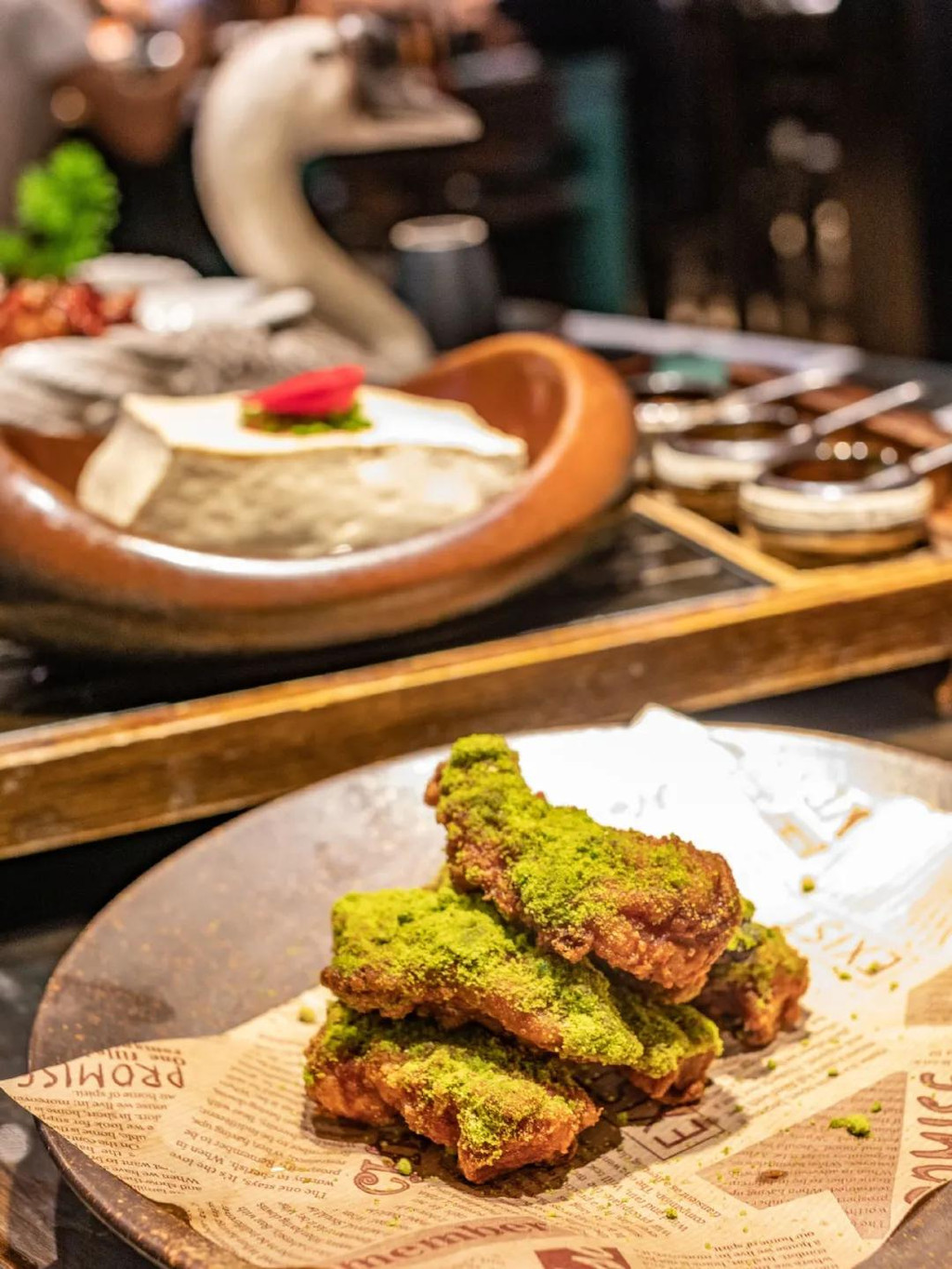 网红绿衣酥脆排骨:店里的特色菜,上面撒了一层抹茶,排骨特别酥脆,肥瘦相间,肉吃起来油而不腻,难以置信我吃了五块,只给老公吃了两块