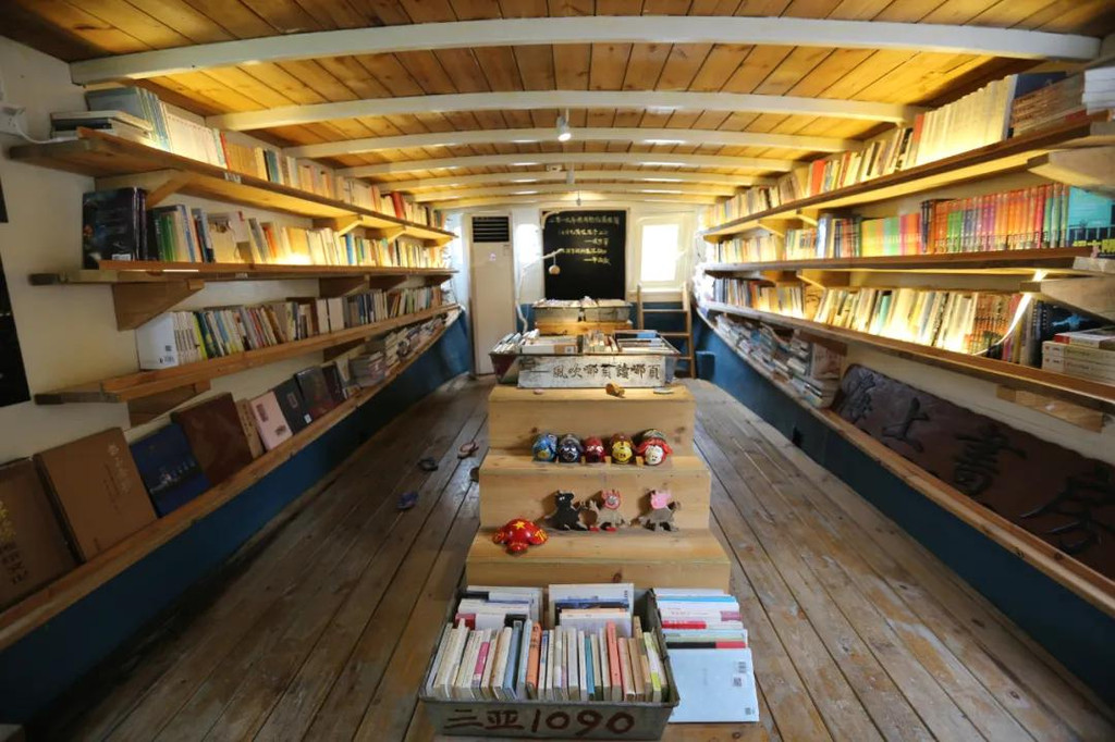 除了文创集市,这里还有一个“海上书房”比较有名气,是一个比较文青的地方,整个书房由3艘废旧轮船改造而成,里面的书大多是捐赠而得,风吹到哪页读哪页,这怡然惬意真不是一般人能过的日子。