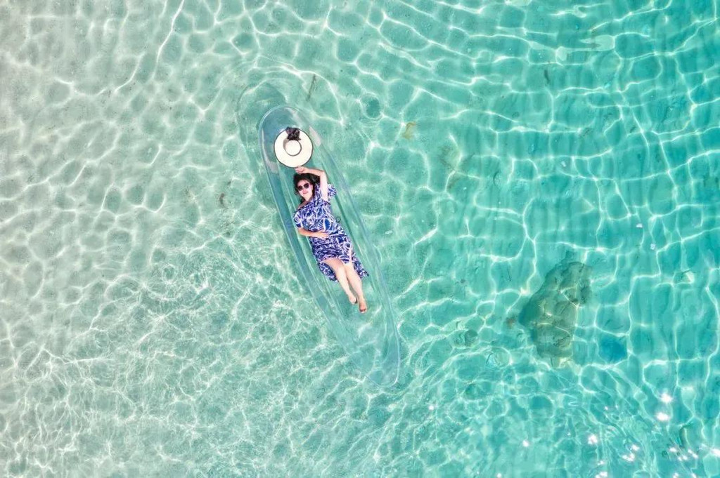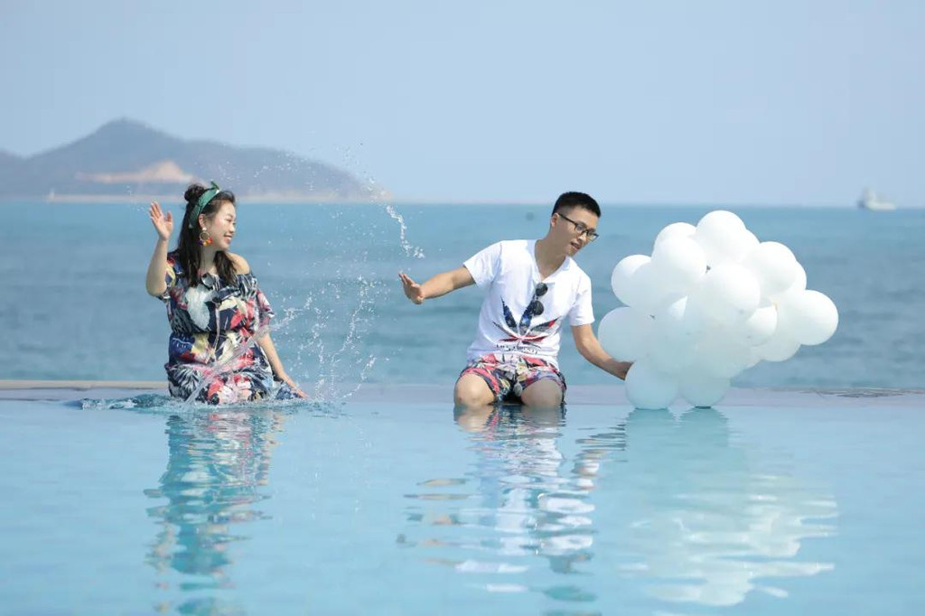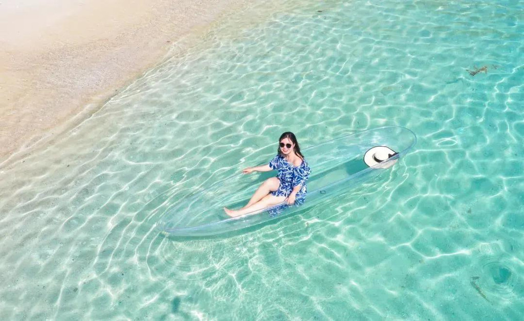 百福岛的最大耍事就是网红船拍照:这个是热度最高、最受女生喜欢的项目,也是上岛后的第一个安排!透明网红船飘荡在波光闪闪的海面,无人机航拍下来的画面简直美呆了~