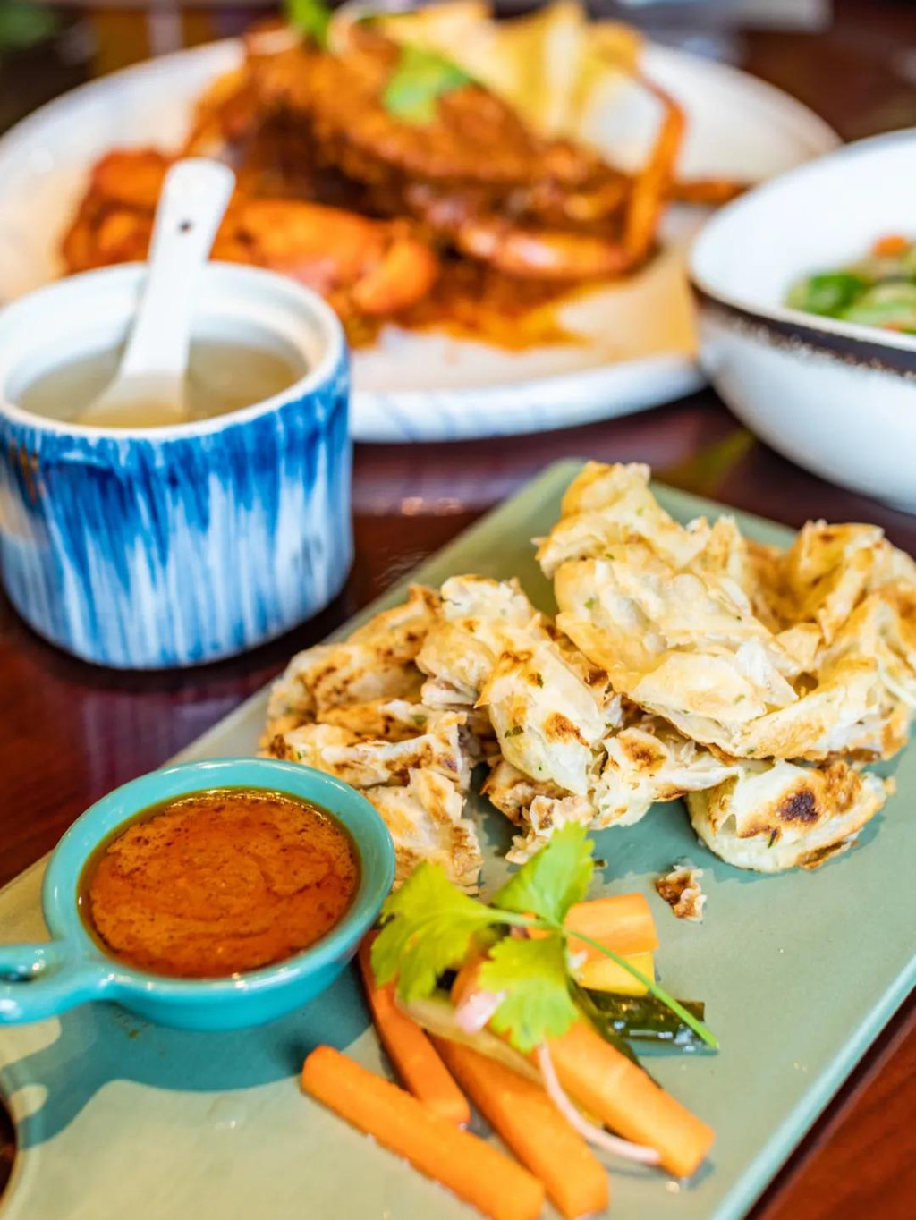 黄油煎饼配咖喱酱:有点像葱油饼,有点脆脆的感觉,配上咖喱酱超可。