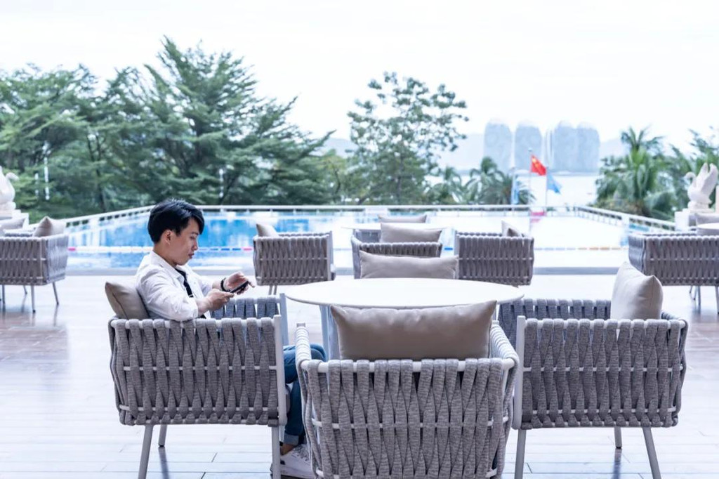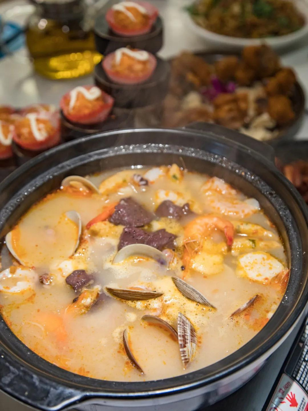 大悦洋是一家户外露天的海鲜自助餐厅,在这里可以感受到浪漫的热带雨林的氛围!户外的座位有遮阳伞,有人造河流和喷泉,周围被绿色的椰子树包围着,用餐环境很浪漫。这里主打海鲜自助火锅,一人一锅,小火锅的锅底选择也很丰富,糟粕醋火锅是特色,建议大家试试这个~