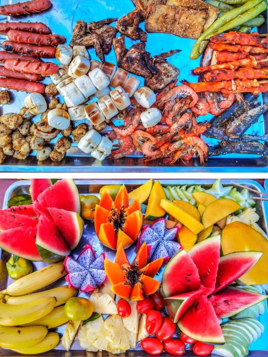 午餐有免费的水果大餐和烧烤,浮潜游泳都挺耗费体力的,所幸这边提供了足够的酒水饮料,在不浪费的前提下可以敞开吃。