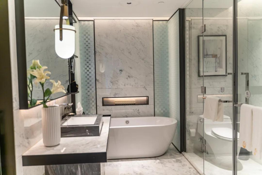 卫生间面积超大,两人的洗漱台、超大的镜子,早晨起来两人可以一起刷牙洗漱,想想都是美好,还有大大的浴缸,晚上给自己弄个舒舒服服的泡泡浴就美滋滋了!