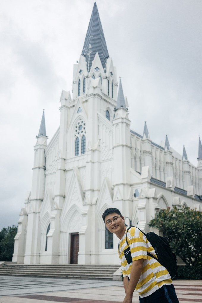 刚下车就被眼前坐落着的哥特式教堂吸引,简洁素雅的白色建筑树立在广场中央,这里原本是计划打造成商业街但人气没有做起来渐渐落寞,现在成了免费的拍照景点了!